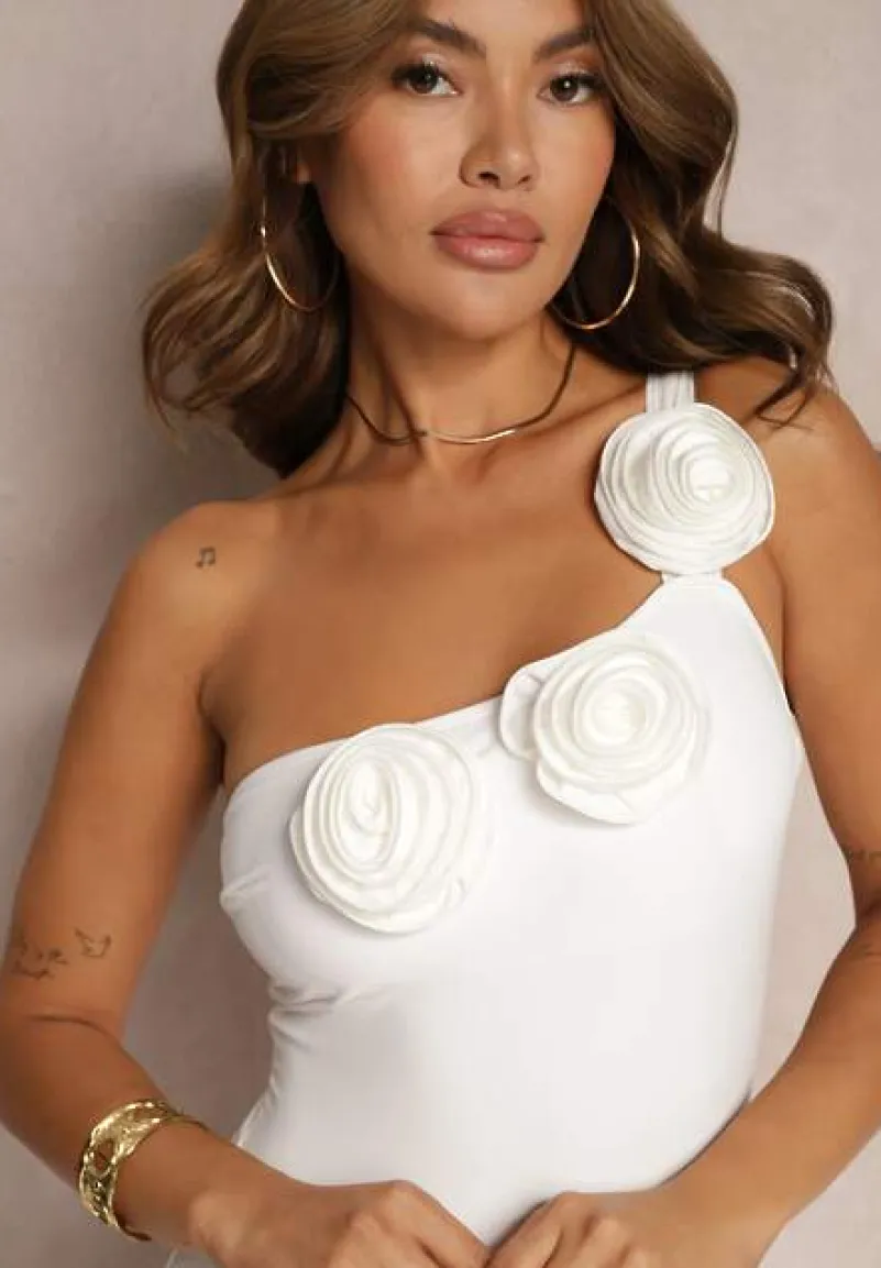 Biały Strój Kąpielowy Jednoczęściowy o Asymetrycznym Kroju z Kwiatową Aplikacją Irisabel