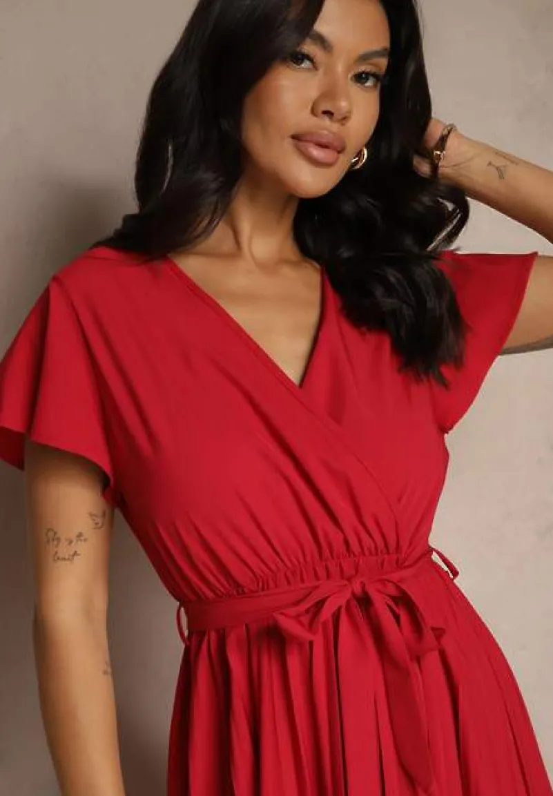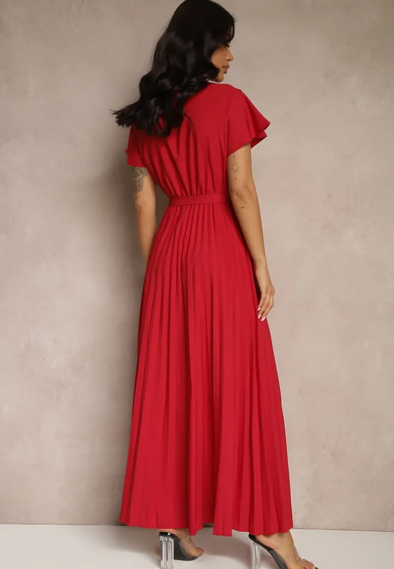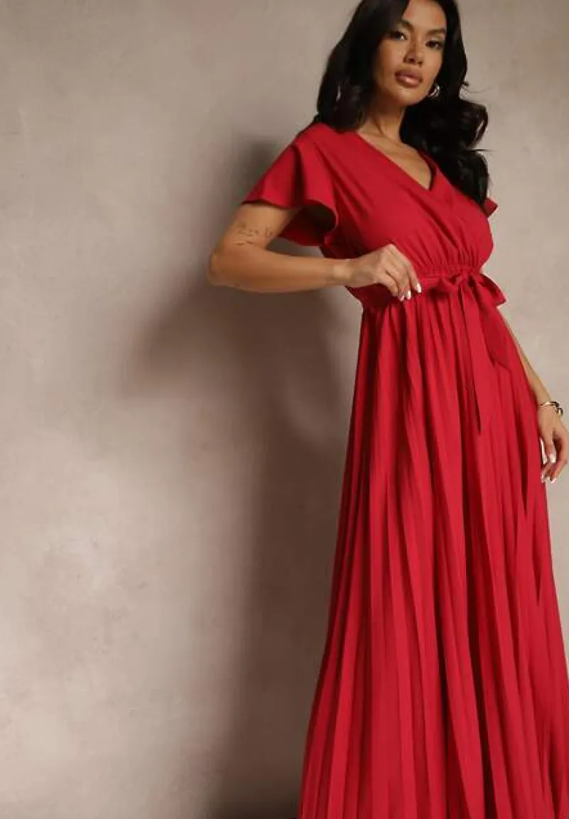 Bordowa Koktajlowa Maxi Sukienka Ozdobiona Plisami z Trójkątnym Dekoltem i Wiązaniem w Talii Phoelia