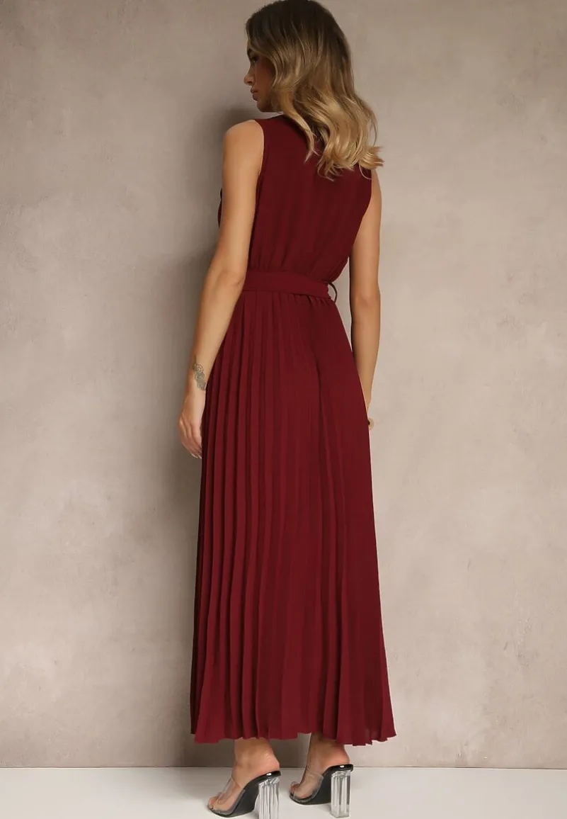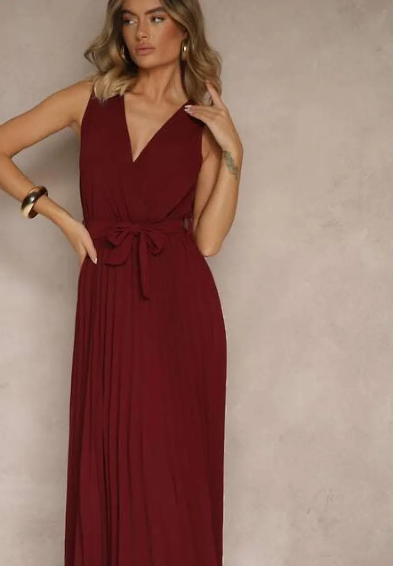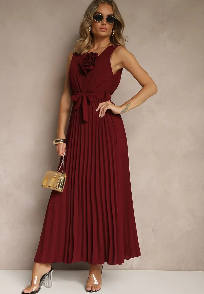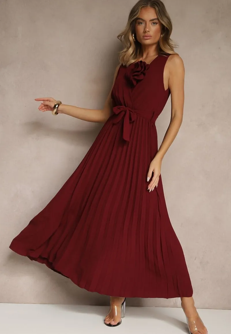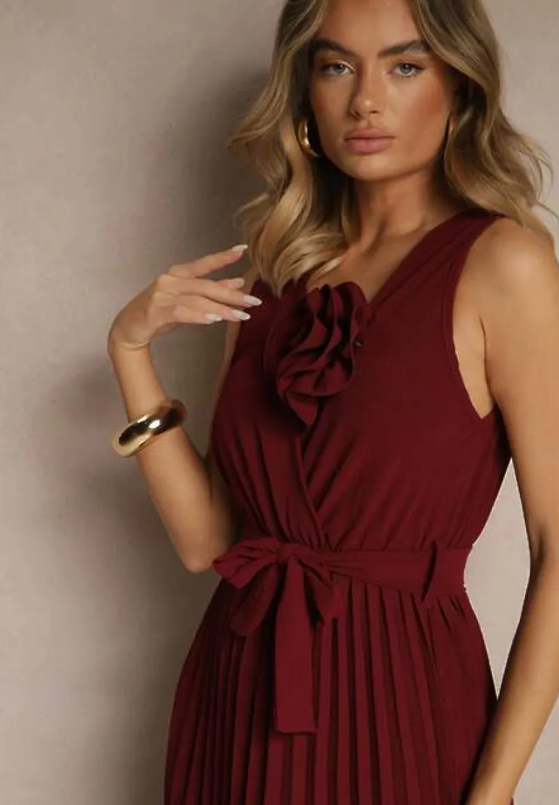 Bordowa Koktajlowa Sukienka Plisowana z Kwiatową Broszką Paskiem i Gumką w Talii Viknna