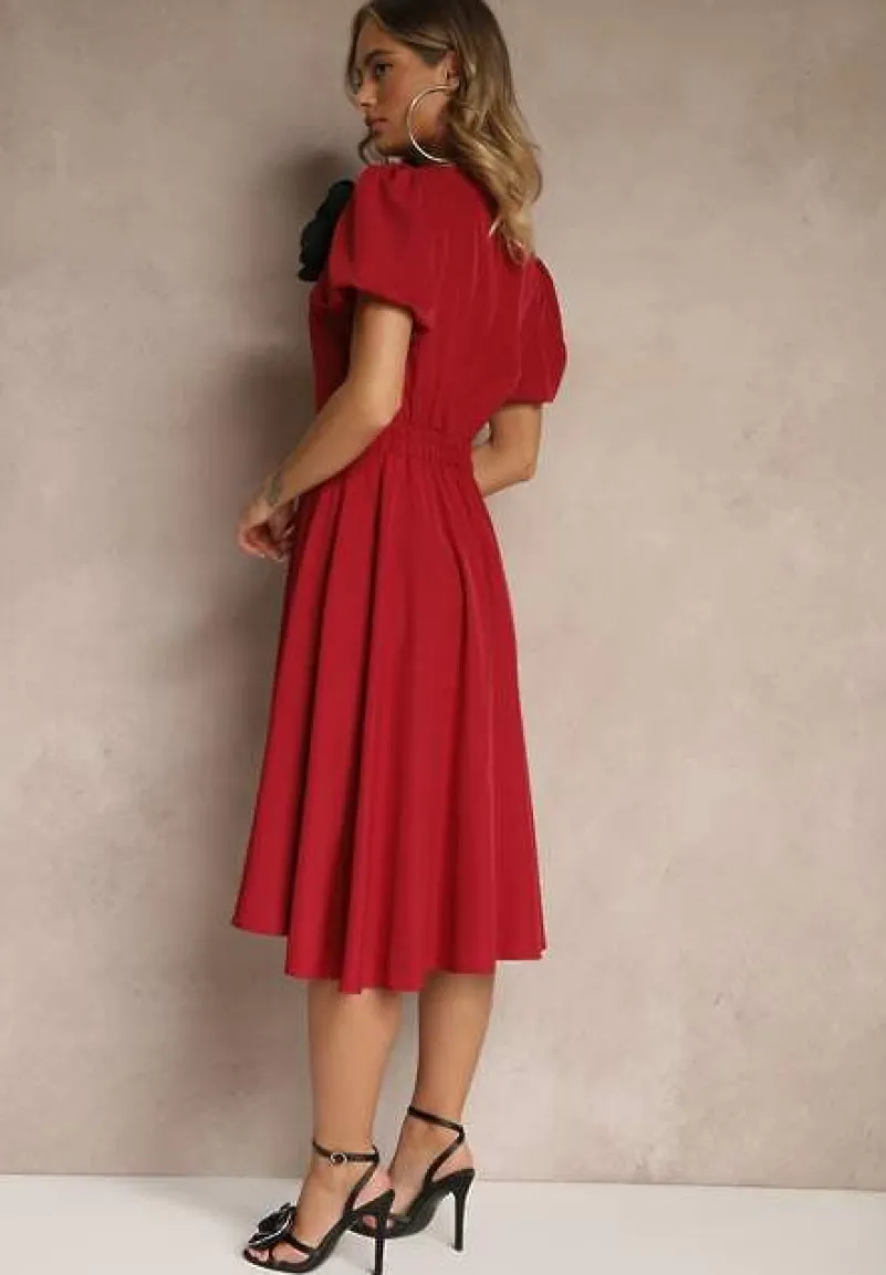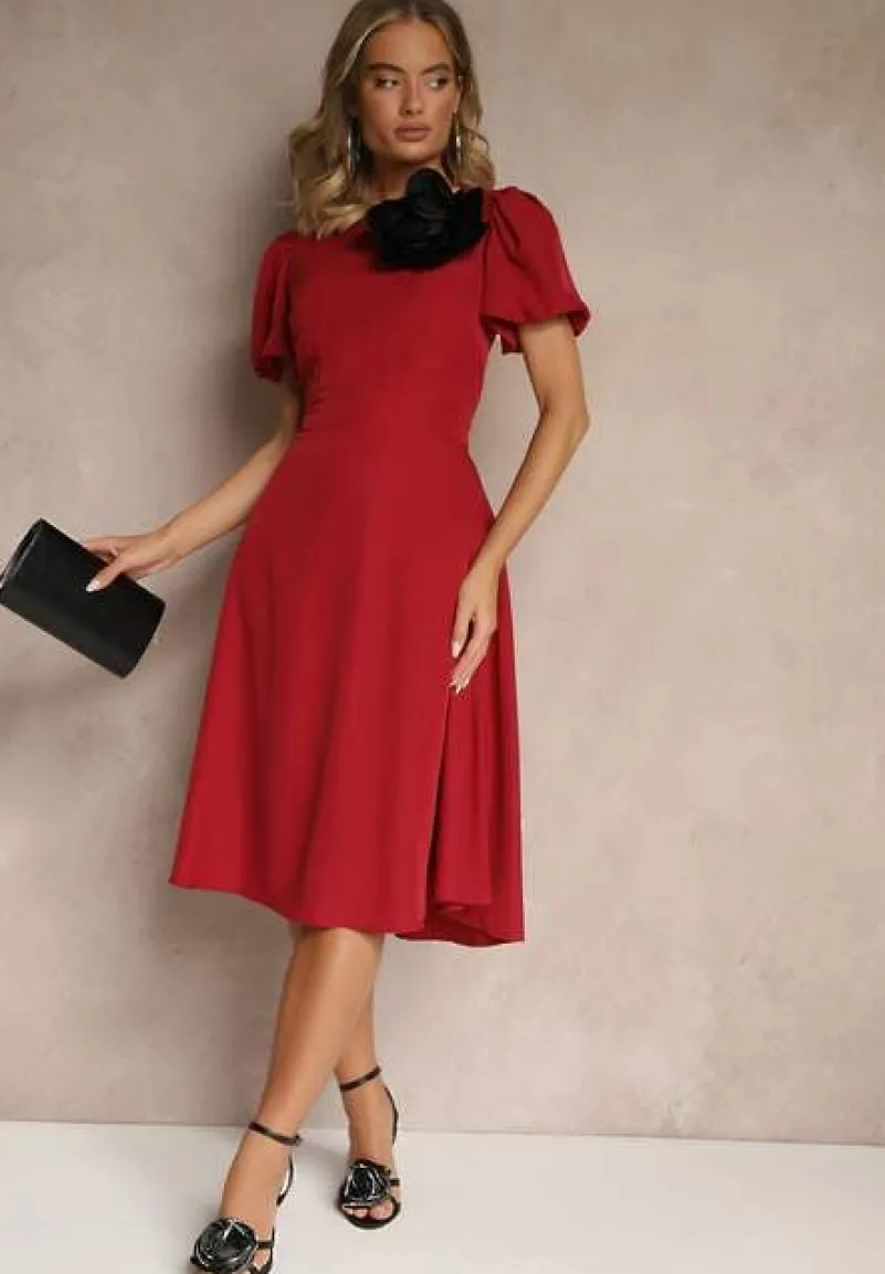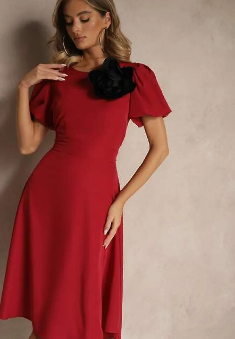 Bordowa Rozkloszowana Sukienka Vices Ozdobiona Odpinanym Kwiatem 3D Koleira