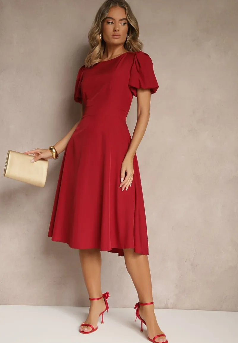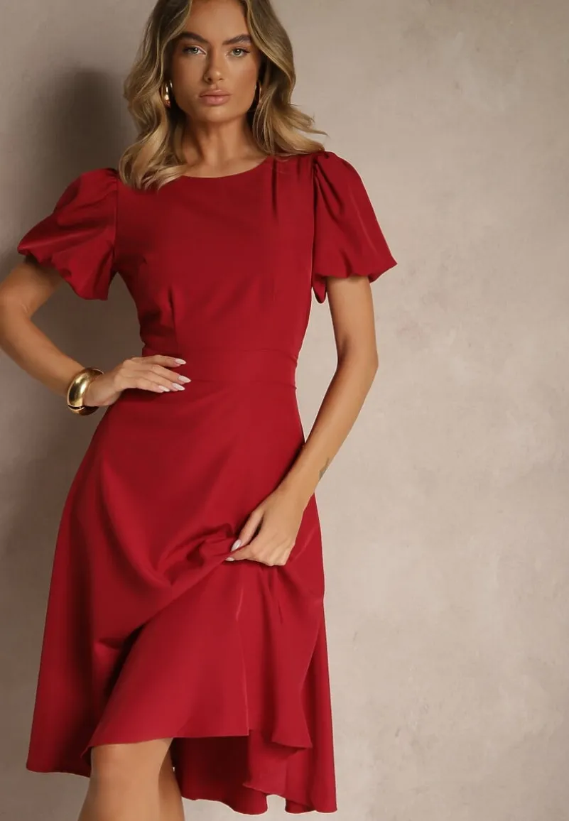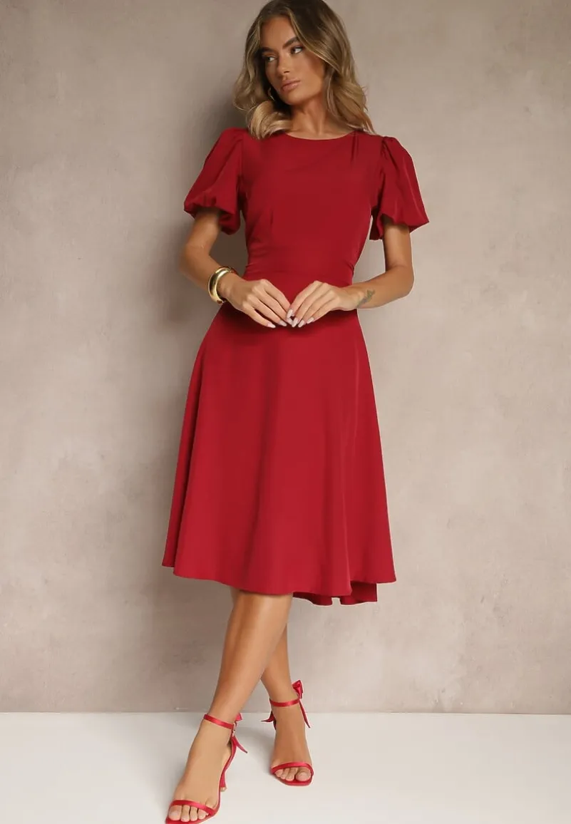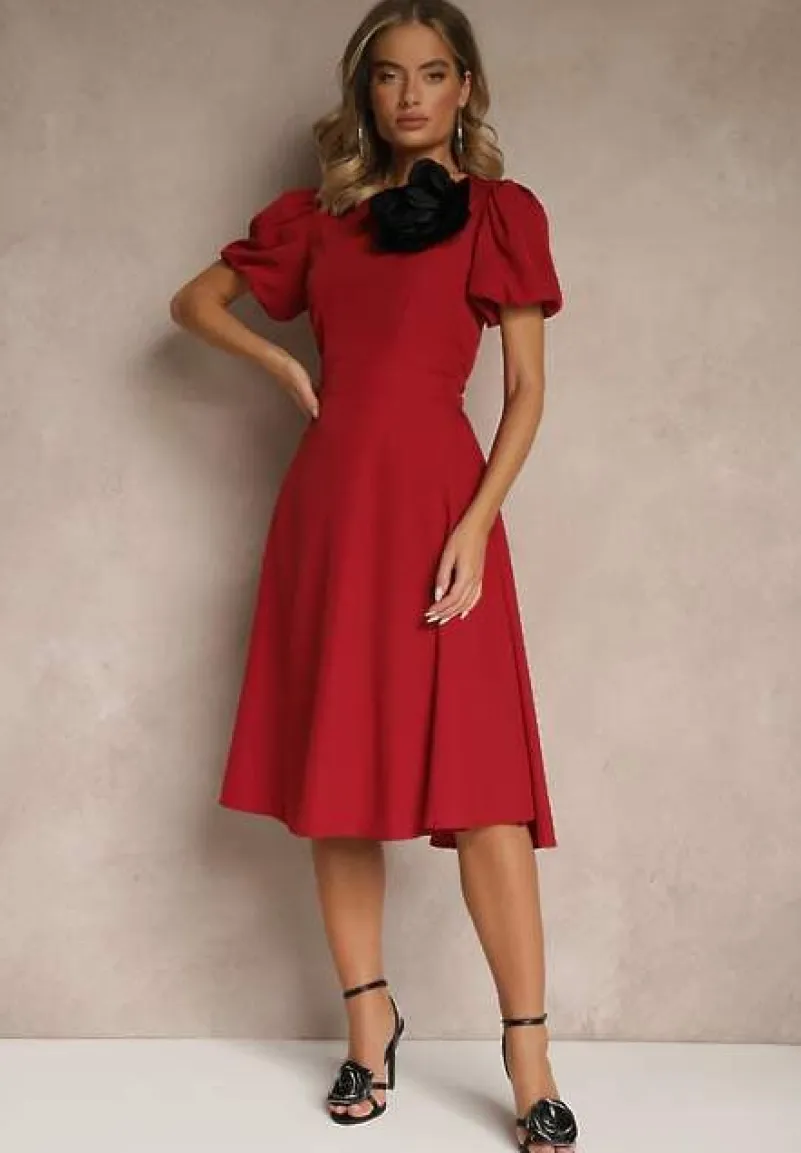 Bordowa Rozkloszowana Sukienka Vices Ozdobiona Odpinanym Kwiatem 3D Koleira