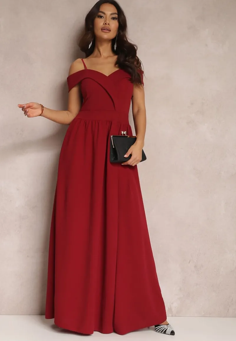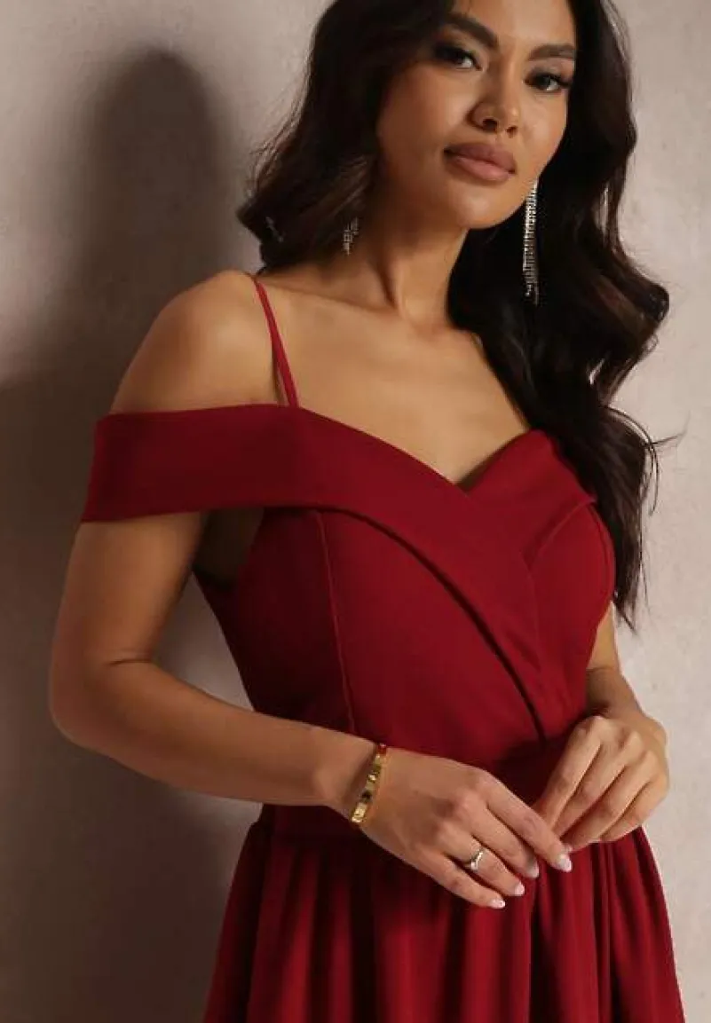 Bordowa Sukienka Koktajlowa z Głębokim Dekoltem Maxi Gelfe