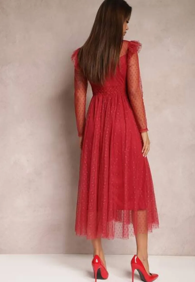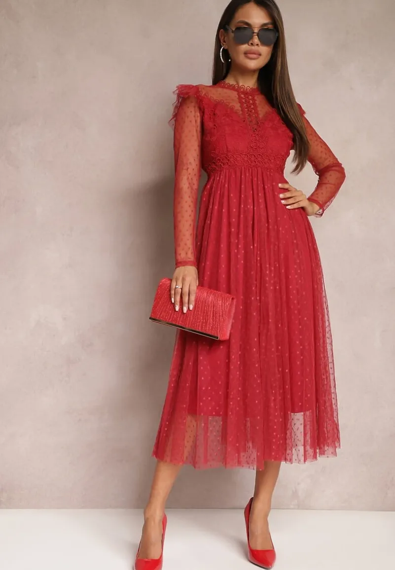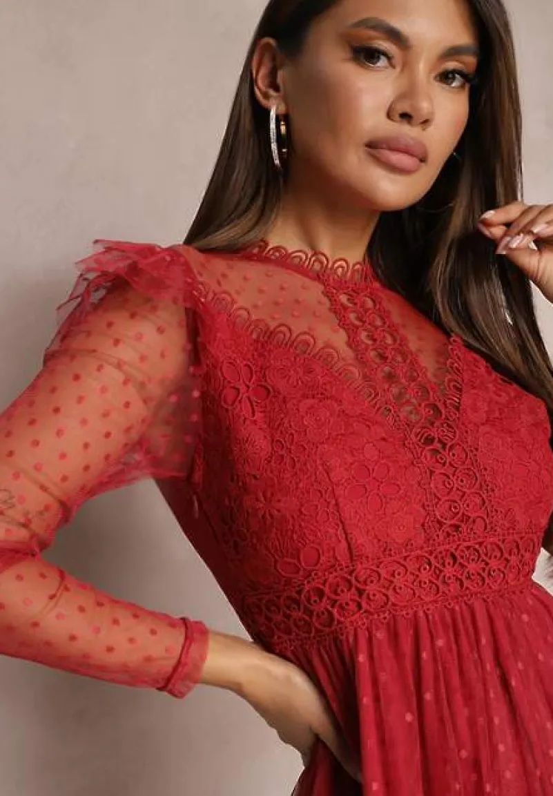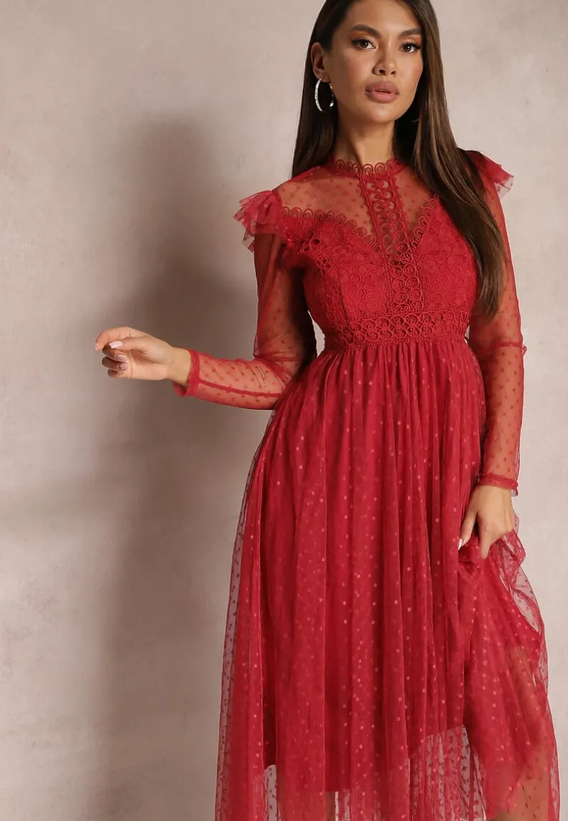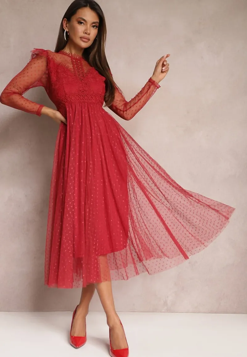 Bordowa Sukienka z Koronką i Tiulem Welvia