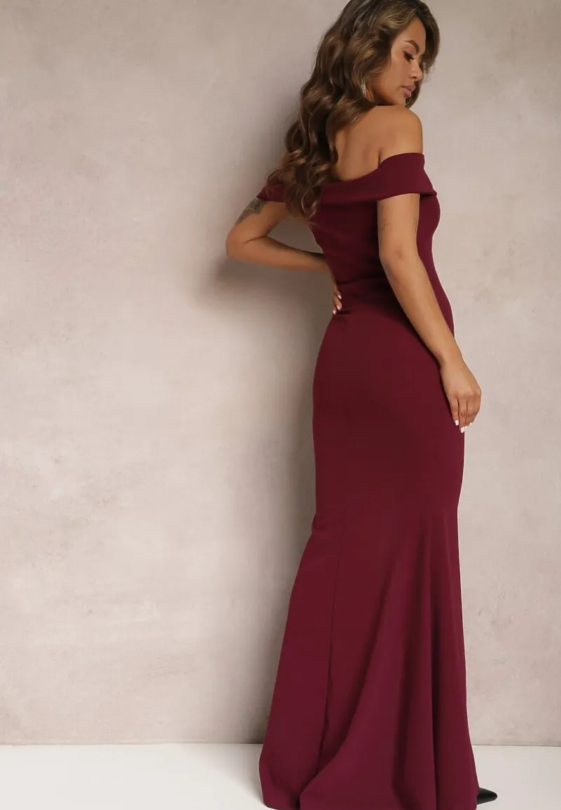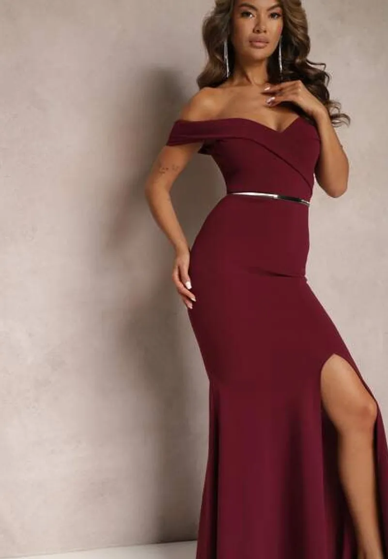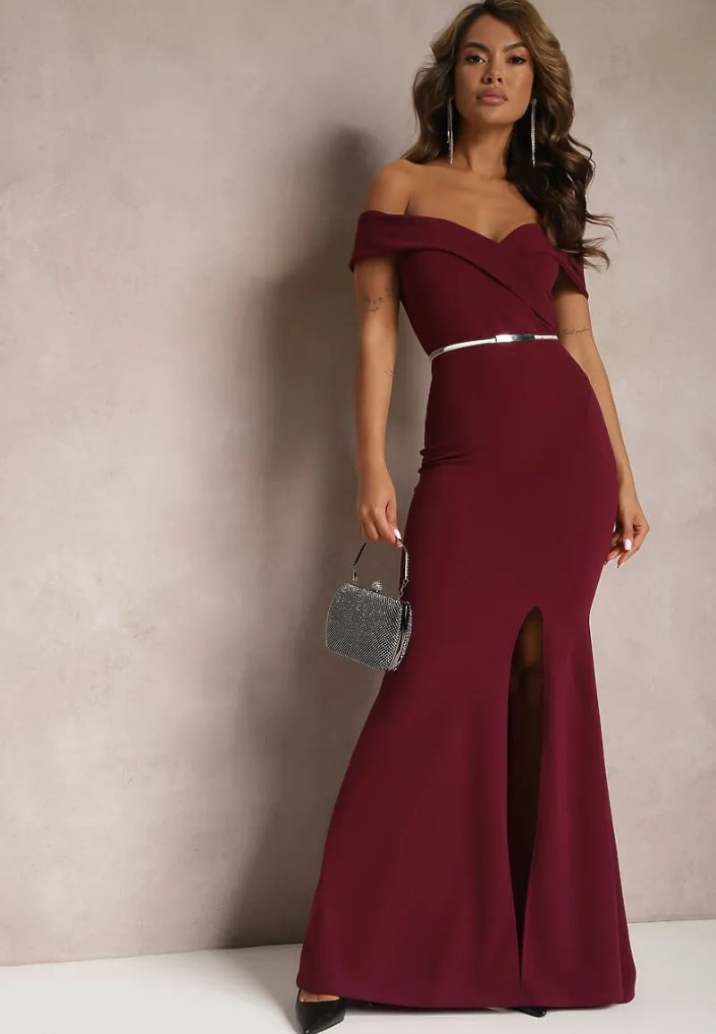 Bordowa Taliowana Sukienka Maxi z Rozcięciem Perlina