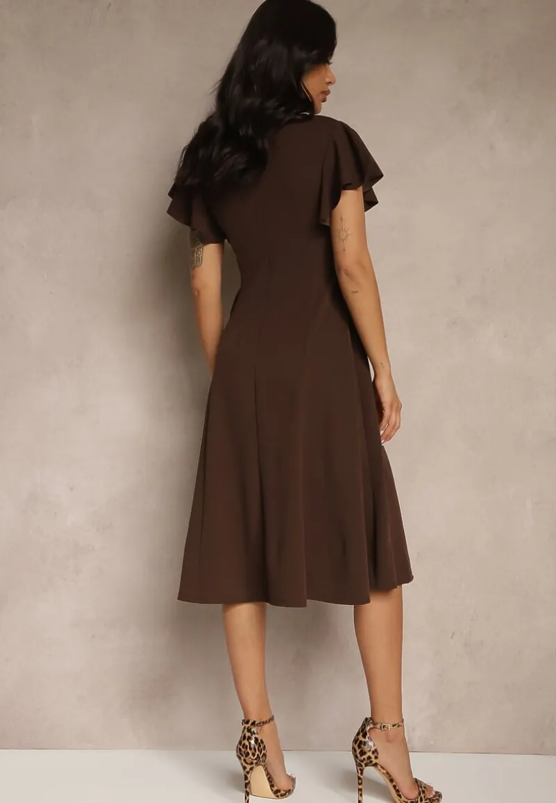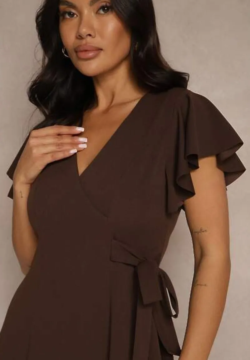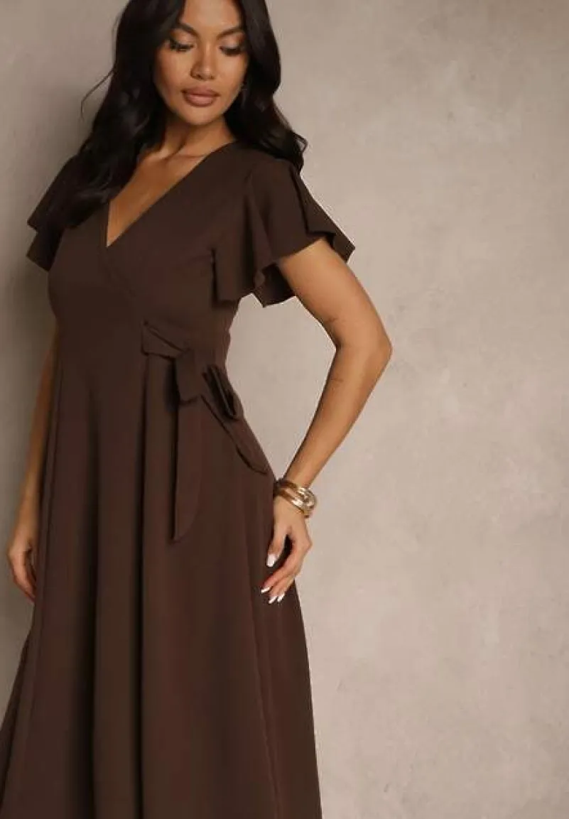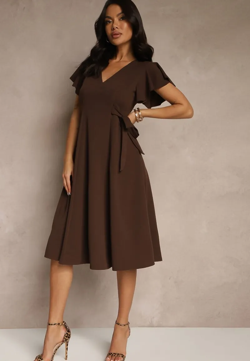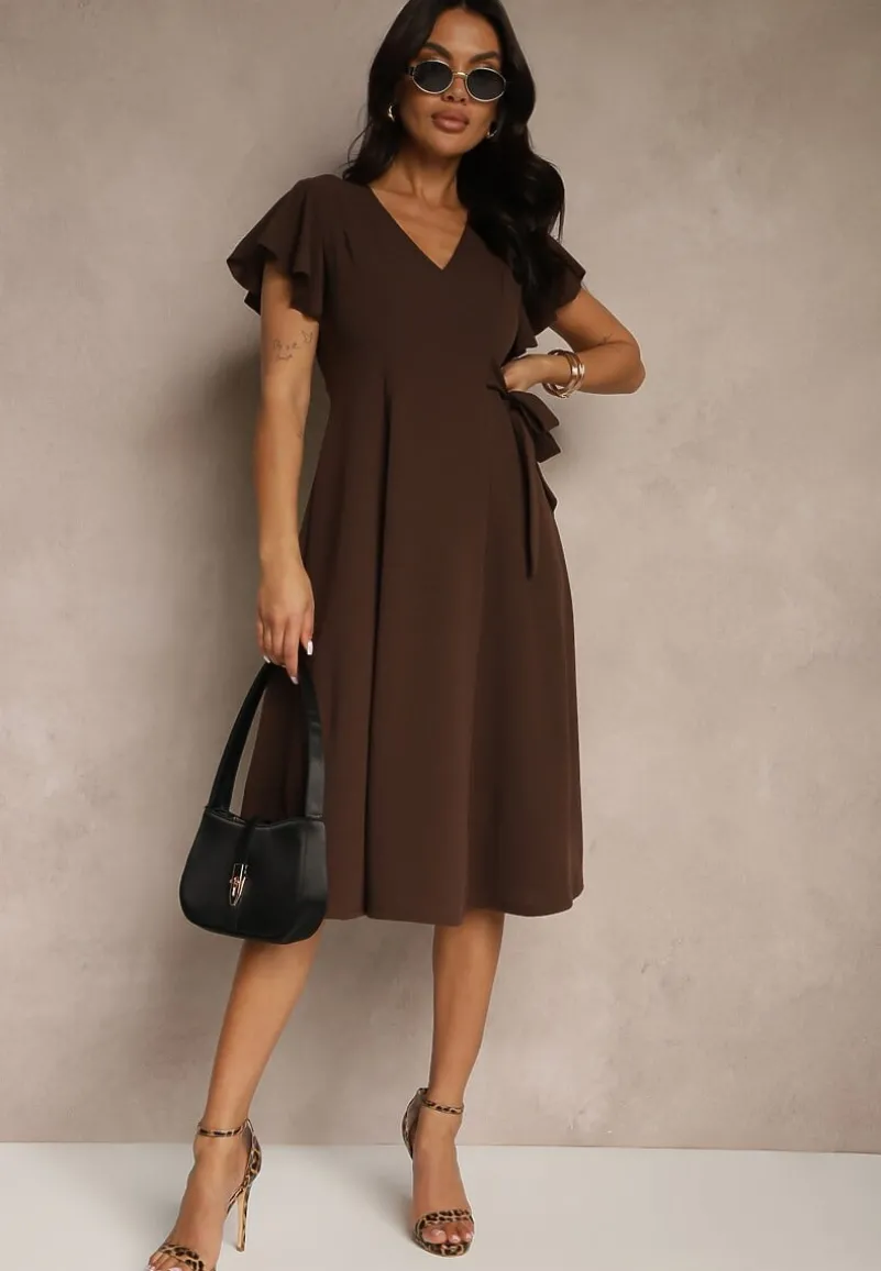 Brązowa Kopertowa Sukienka z Rozkloszowanym Dołem i Ozdobnym Wiązaniem Dannola