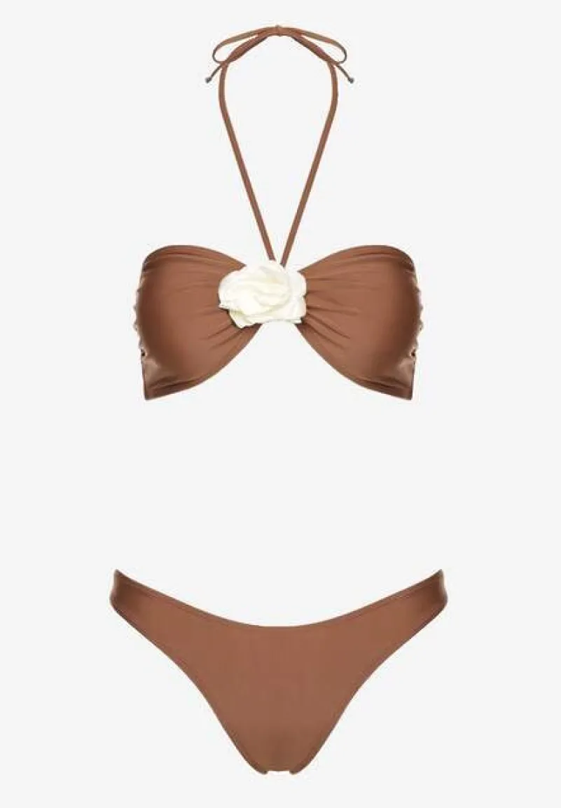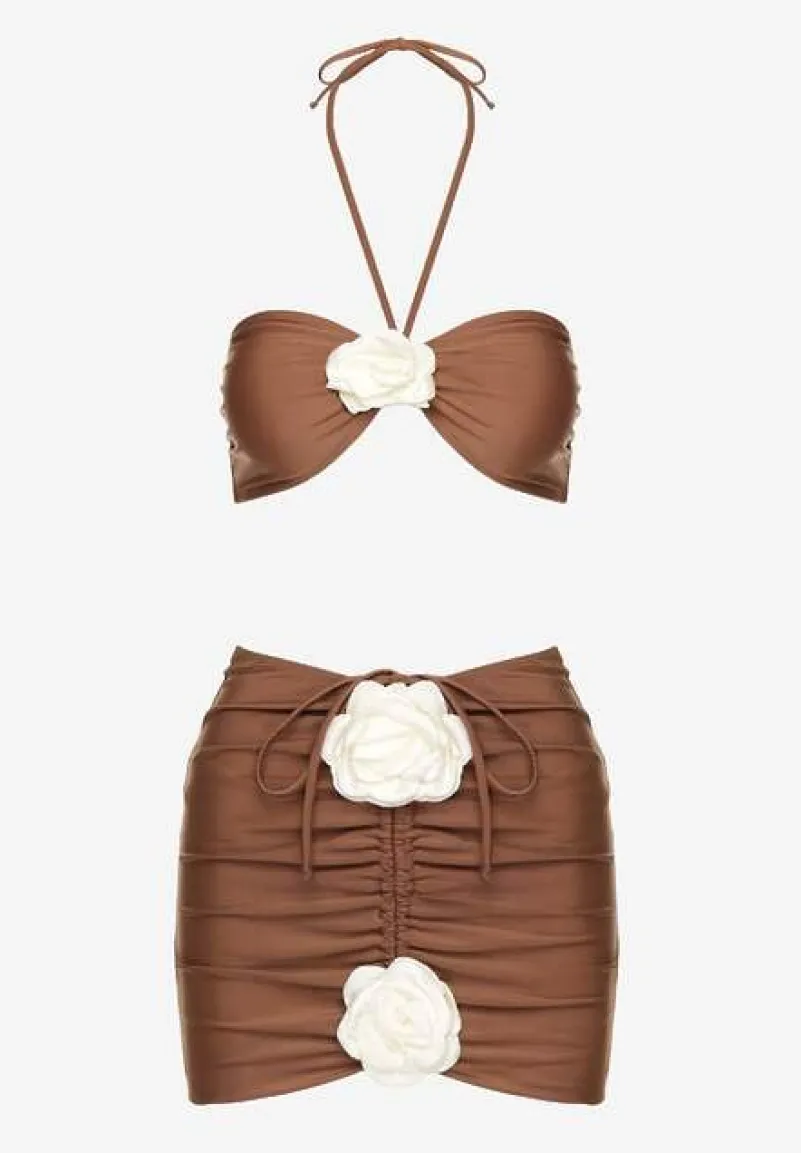 Brązowe Bikini ze Spódniczką Ozdobione Kwiatową Aplikacją 3D Coren