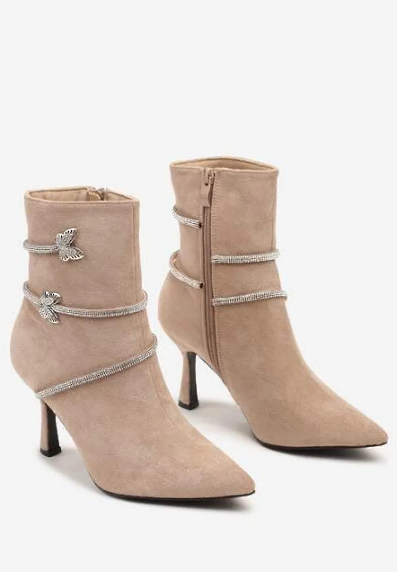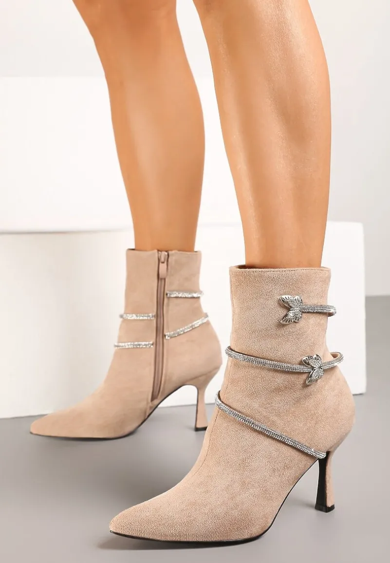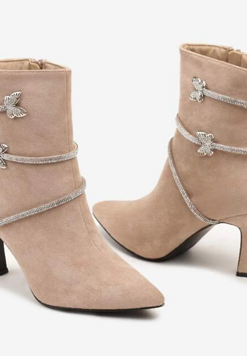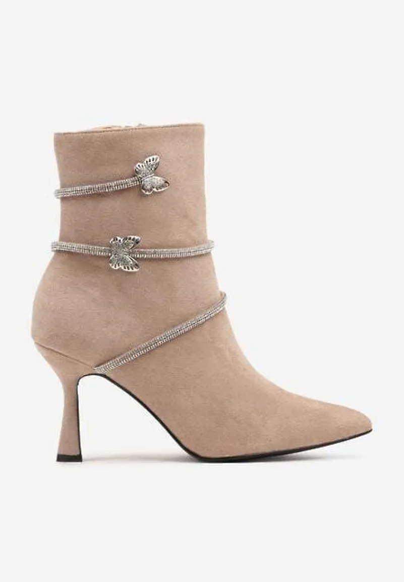 Botki Sassilie z efektownymi motylami to kwintesencja stylu i elegancji, które nie pozostaną niezauważone. Zgrabny obcas w typie szpilki pięknie wydłuża nogi i dodaje pewności siebie przy każdym kroku. Fason z ostrym noskiem przyciąga wzrok i stanowi klasykę w nowoczesnym wydaniu. Z boku botki znajduje się zapięcie na suwak, które ułatwia zakładanie. Wyobraź sobie ten model w połączeniu z taliowaną marynarką i rurkami dla dnia pełnego wrażeń, albo z elegancką sukienką koktajlową na wieczorne wyjście. Stworzą idealny duet z osobowością równie wyróżniającą się jak Ty!
