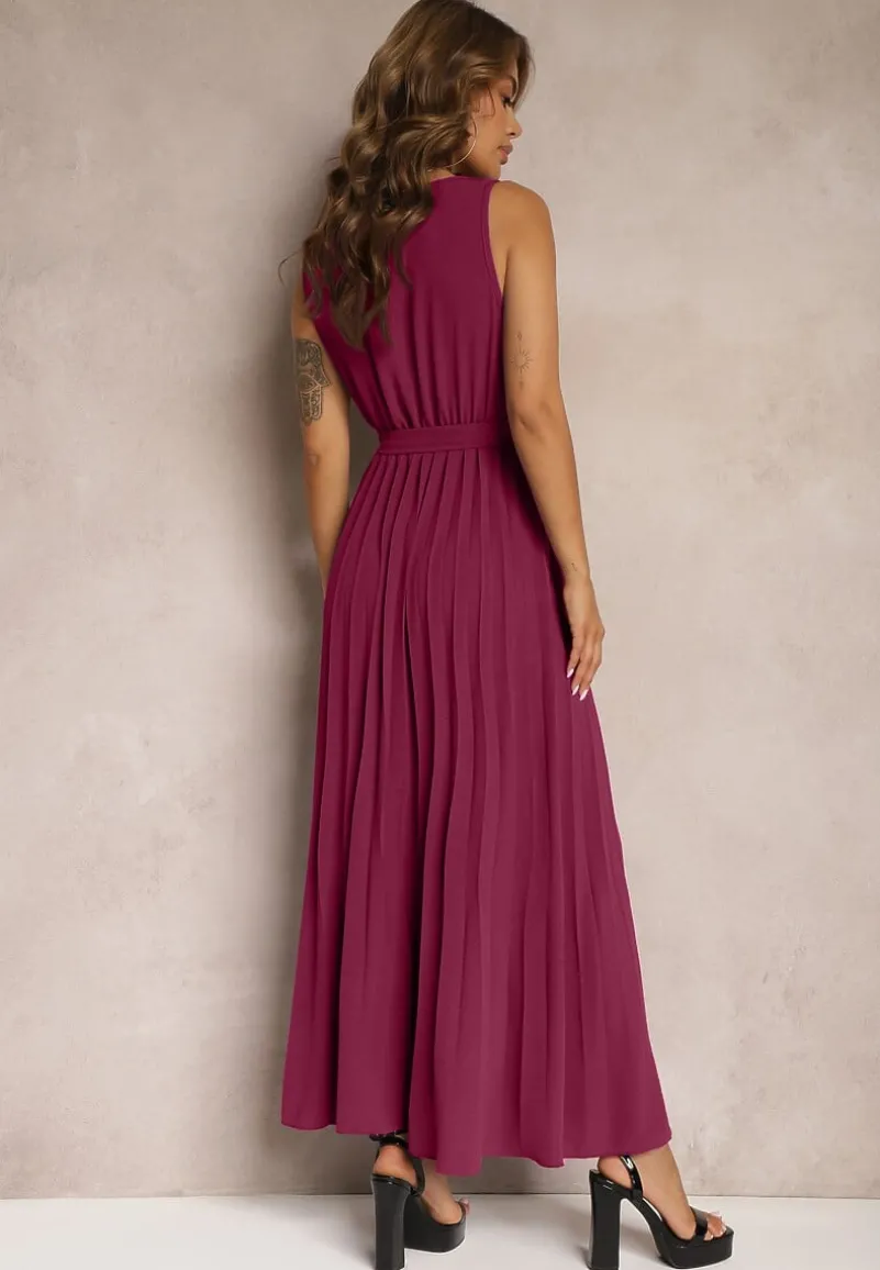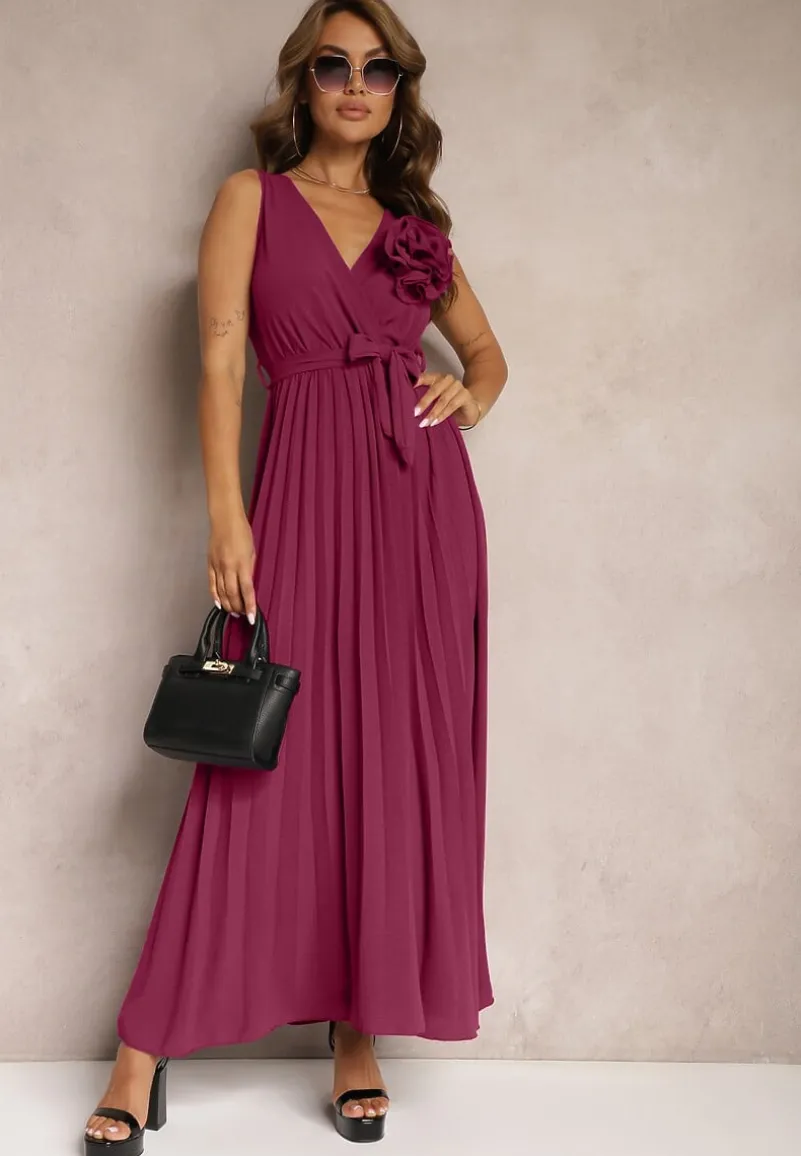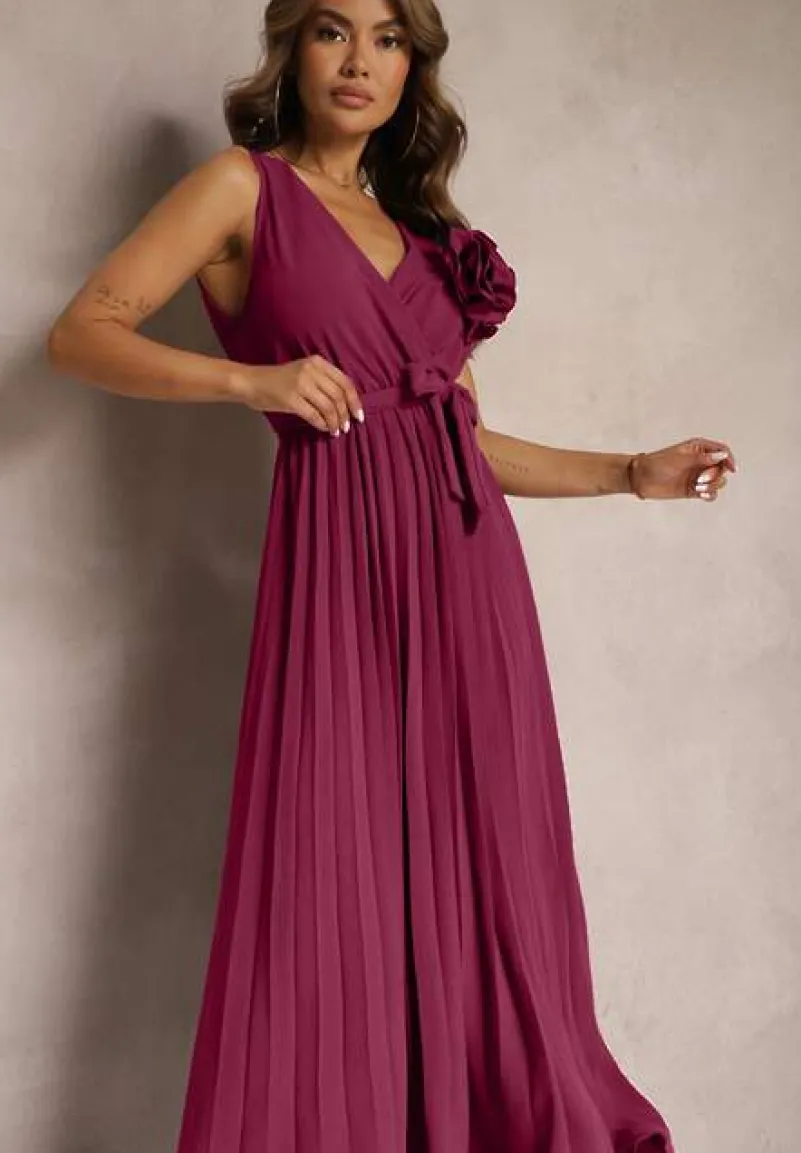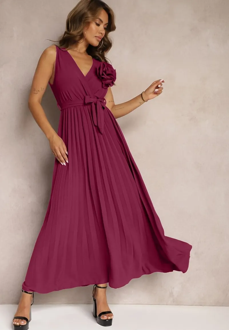 Ciemnofioletowa Koktajlowa Sukienka Plisowana z Kwiatową Broszką Paskiem i Gumką w Talii Viknna