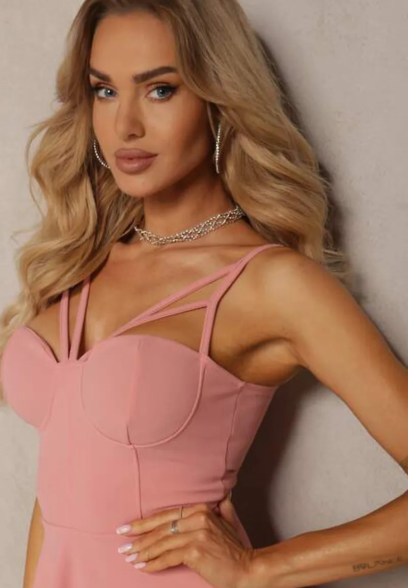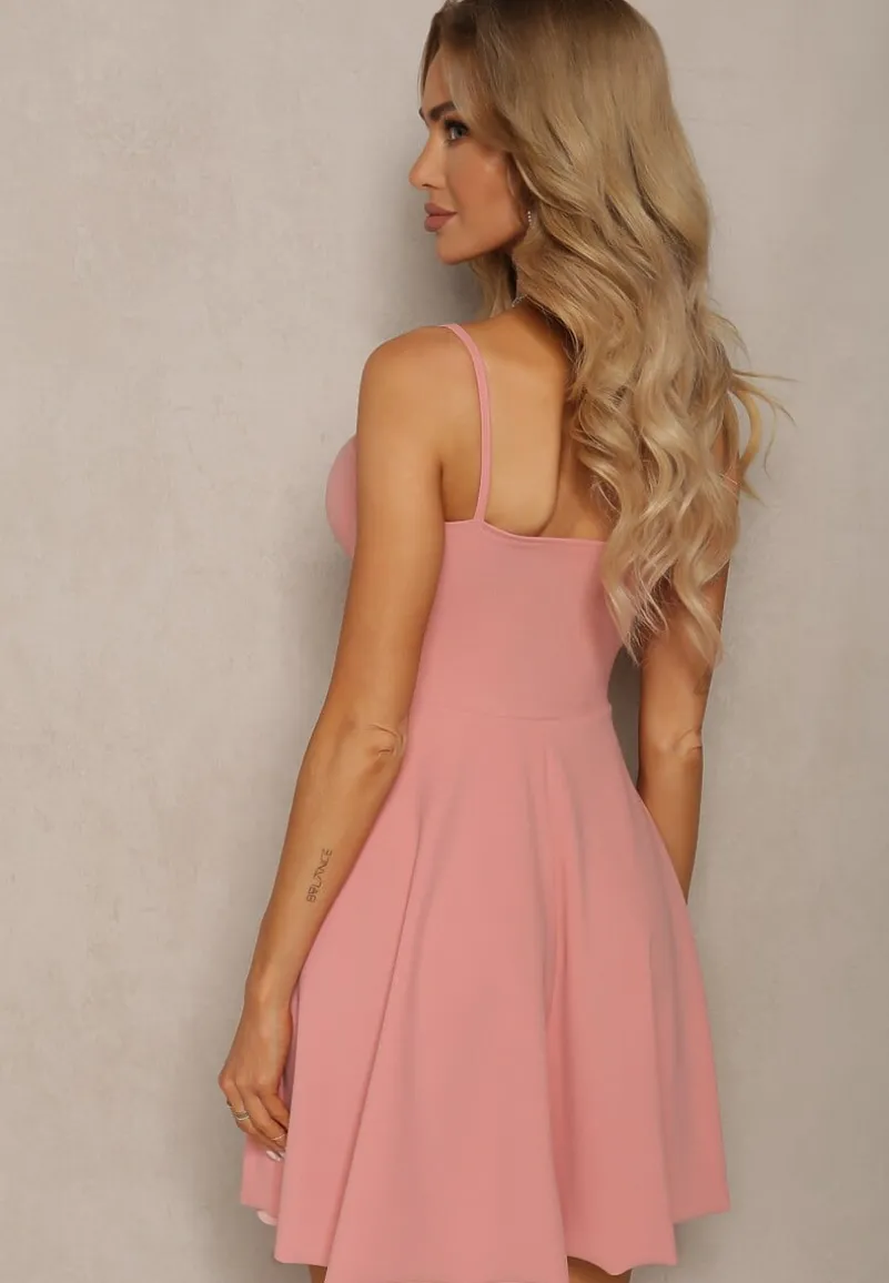 Ciemnoróżowa Sukienka o Rozkloszowanym Kroju z Usztywnianymi Miseczkami i Ozdobnymi Ramiączkami Clemdia