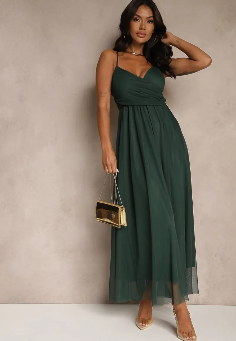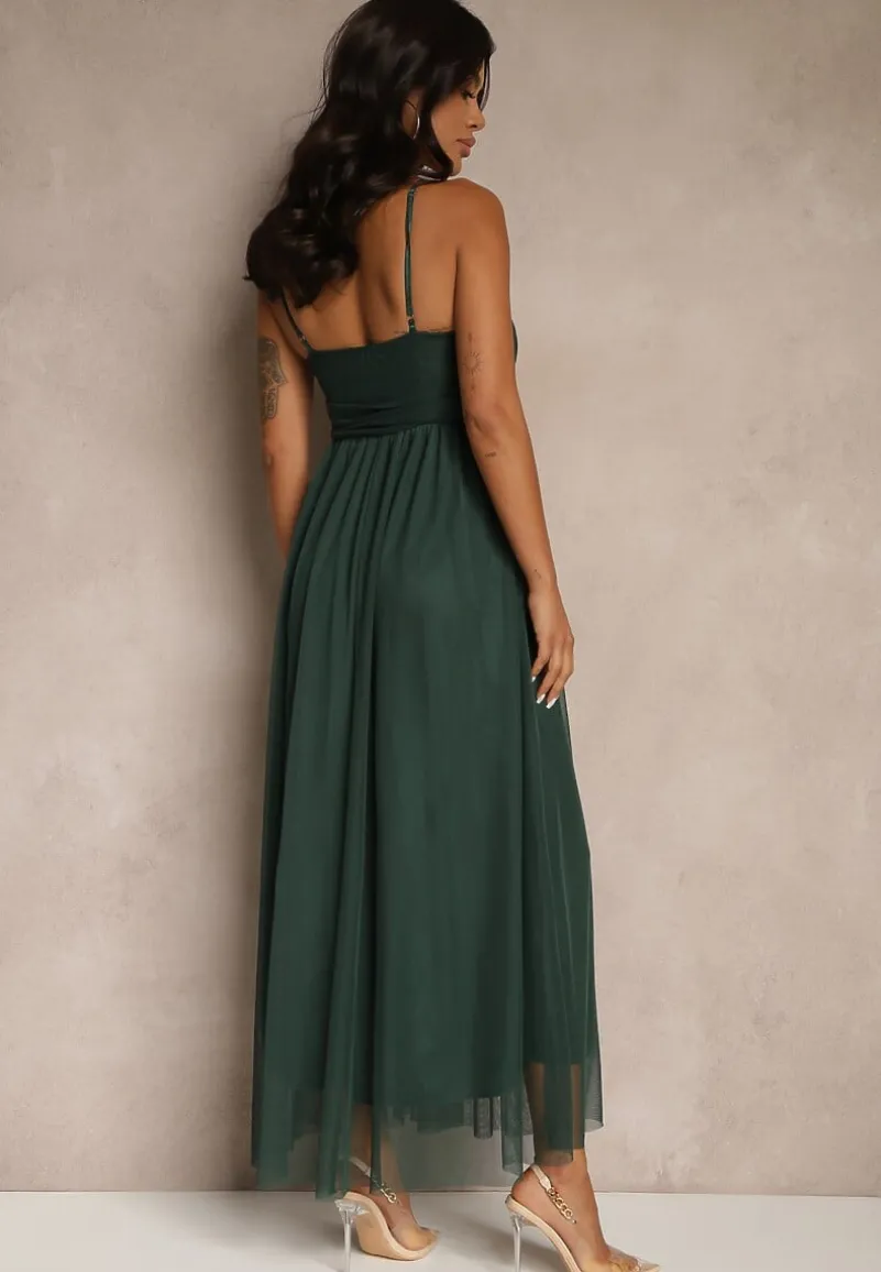 Ciemnozielona Sukienka Koktajlowa Ozdobiona Tiulowym Materiałem Deviora