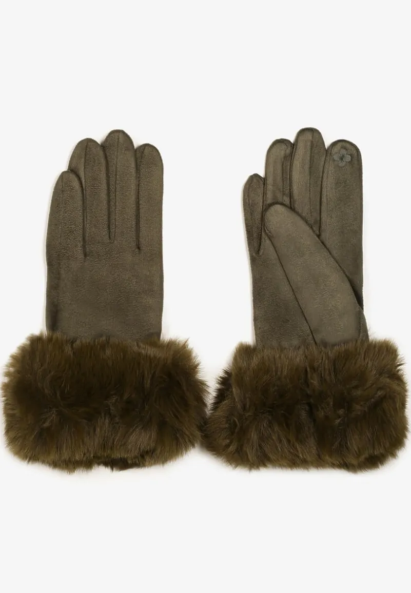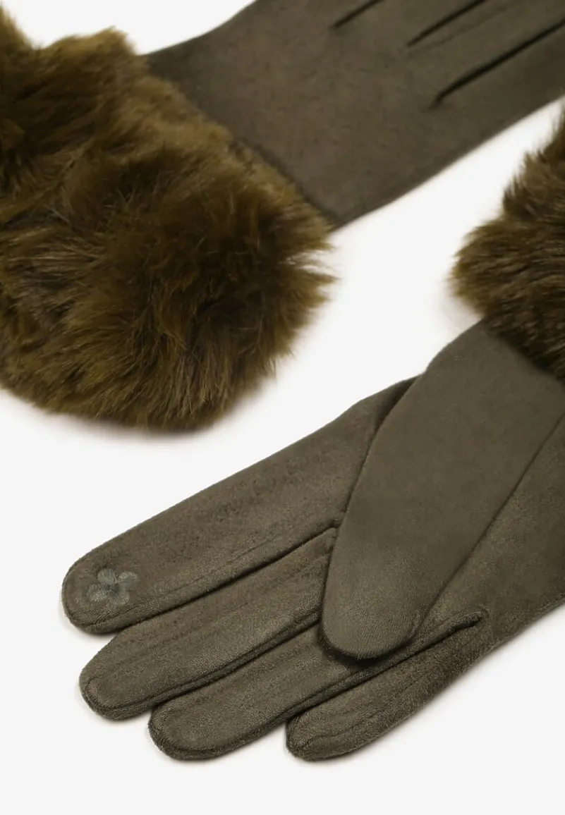 Ciemnozielone Eleganckie Rękawiczki z Ozdobnym Futerkiem Welinna