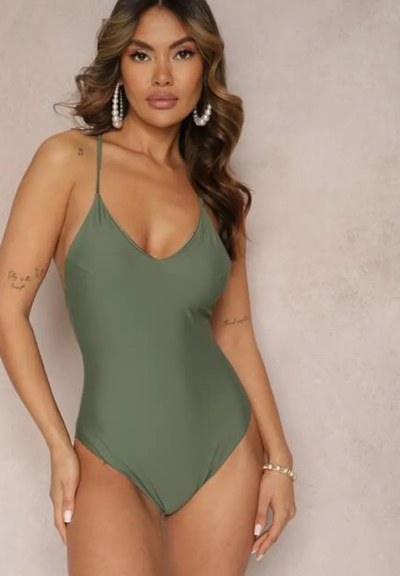 Ciemnozielony Jednoczęściowy Strój Kąpielowy z Ozdobnym Wiązaniem na Plecach Bosiara