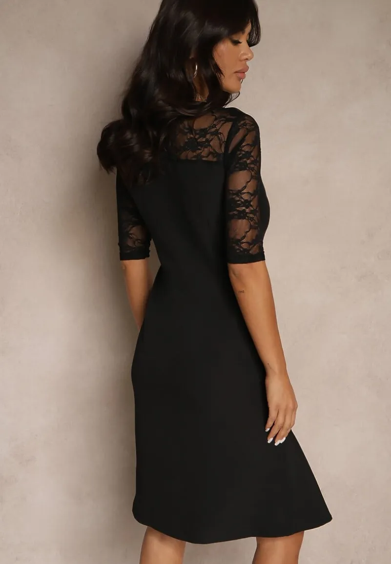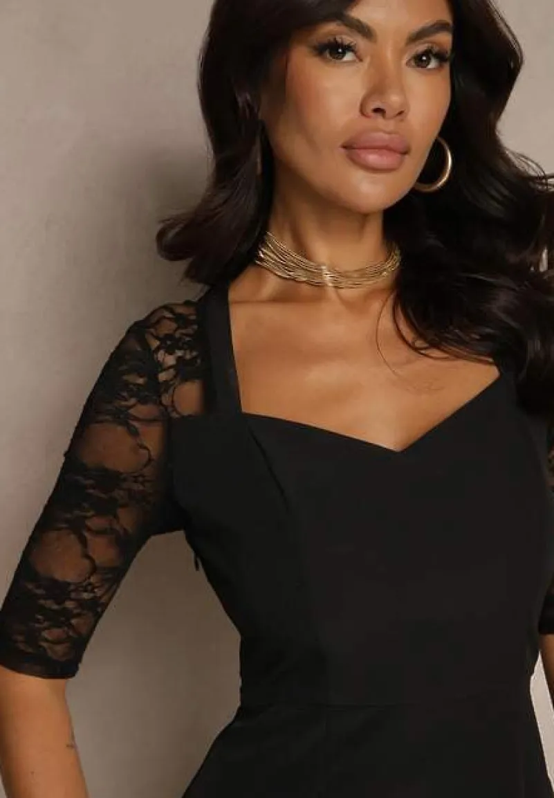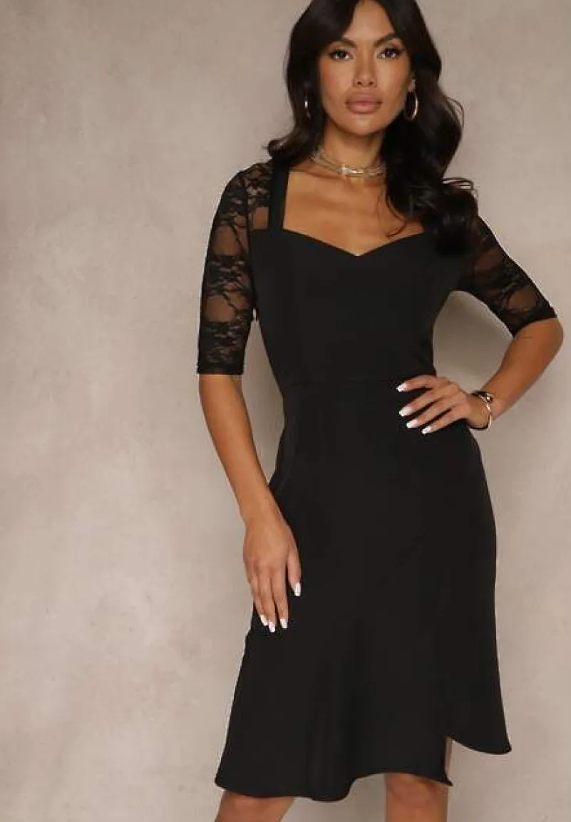 Czarna Dopasowana Sukienka Vices o Asymetrycznym Fasonie Zdobiona Koronką Natileira