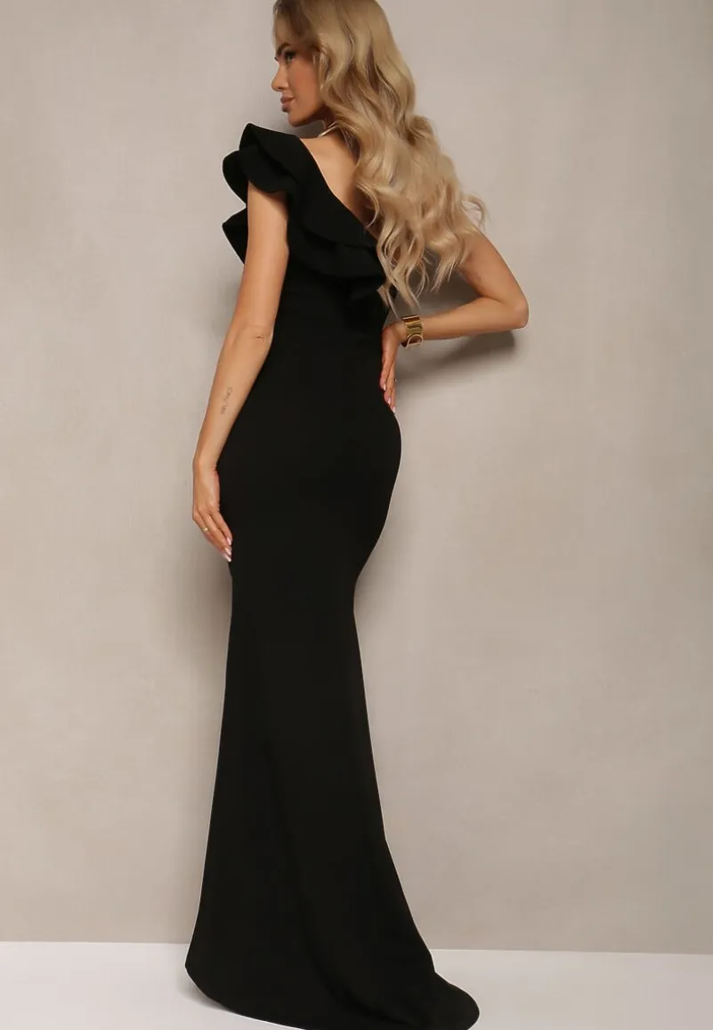 Czarna Elegancka Asymetryczna Sukienka Zakładana przez Głowę z Falbanką i Rozcięciem Adnelia