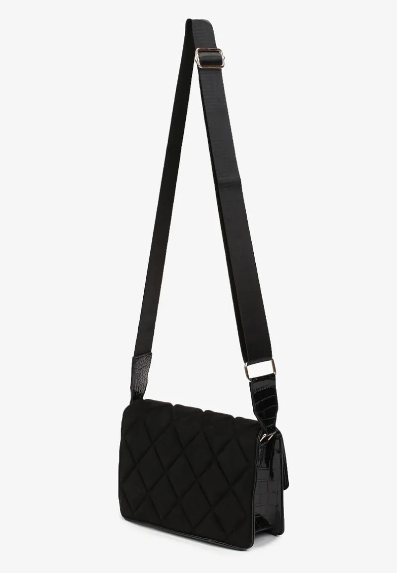Torebka Maridi z regulowanym, szerokim paskiem. W środku posiada jedną komorę, jest zapinana na zamek błyskawiczny, a z przodu dodatkowo na zatrzask. Wykonana z połączenia pikowanej tkaniny i lakierowanej ekoskóry imitującej skórę węża. To oryginalny dodatek, który doda subtelnego akcentu Twojej stylizacji.
