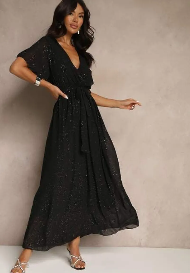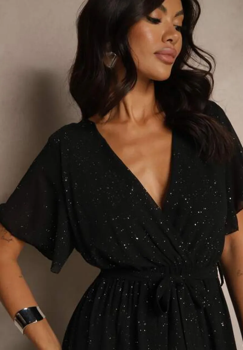 Czarna Koktajlowa Brokatowa Sukienka z Paskiem Addlea