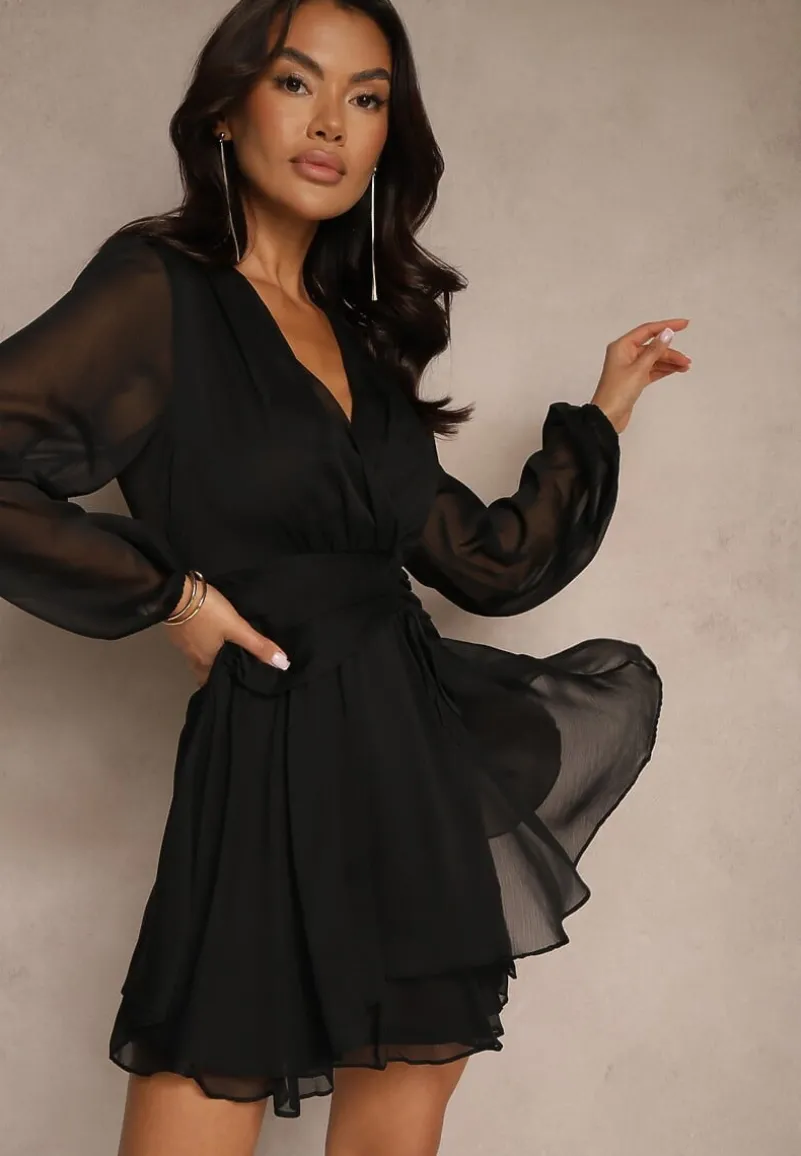Czarna Kopertowa Sukienka z Prześwitującymi Rękawami o Rozkloszowanym Dole Ninelira