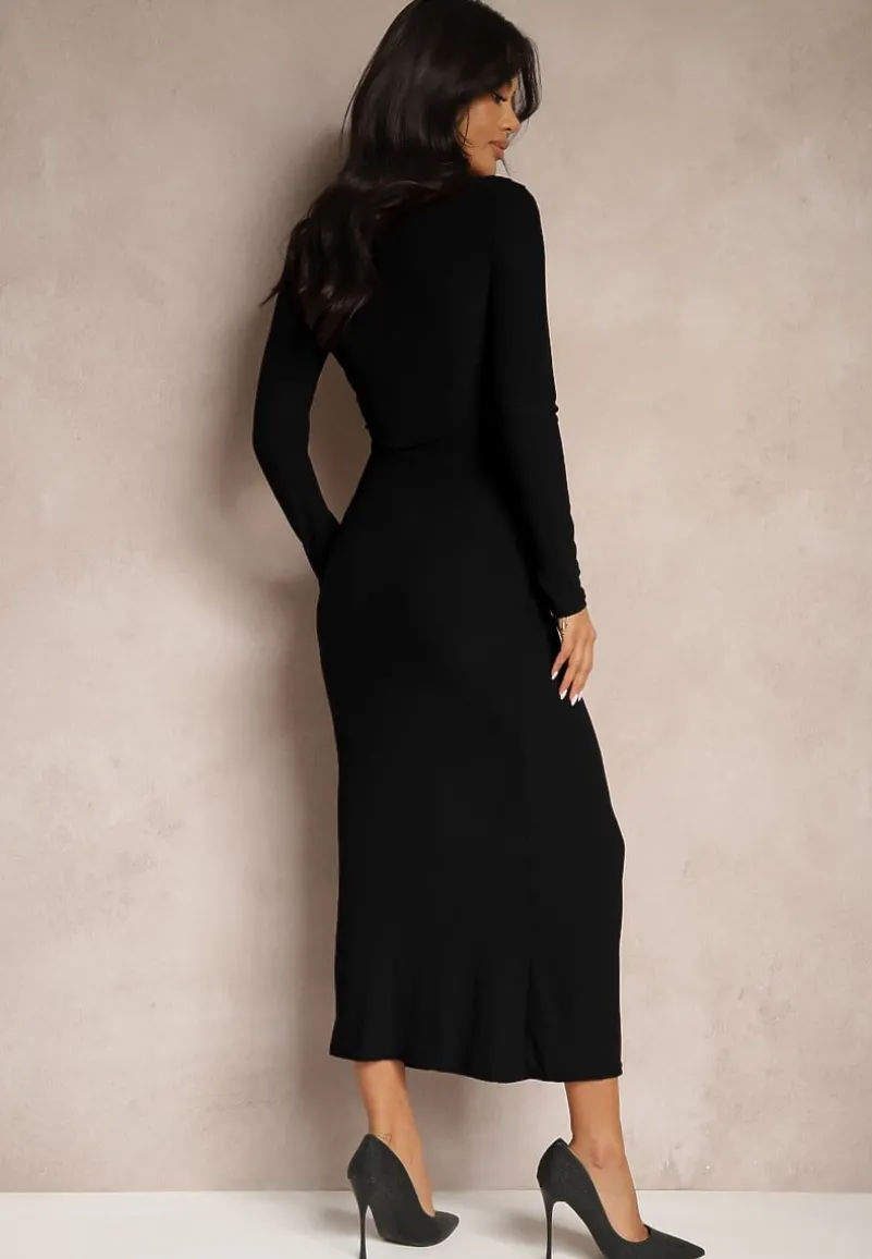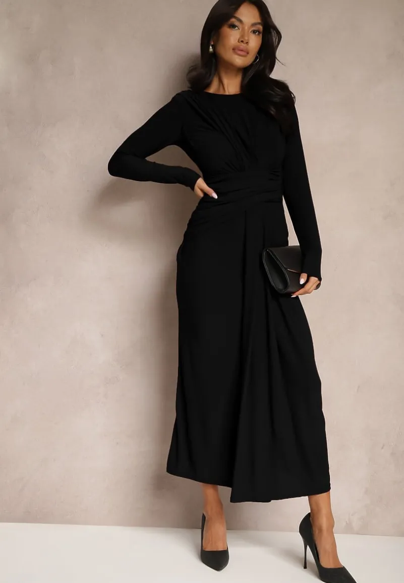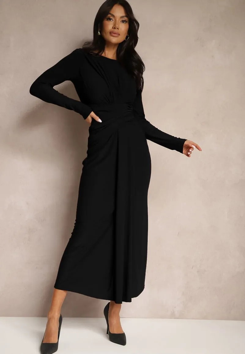 Czarna Marszczona Sukienka o Dopasowanym Kroju z Długim Rękawem i Trenem Sennariel