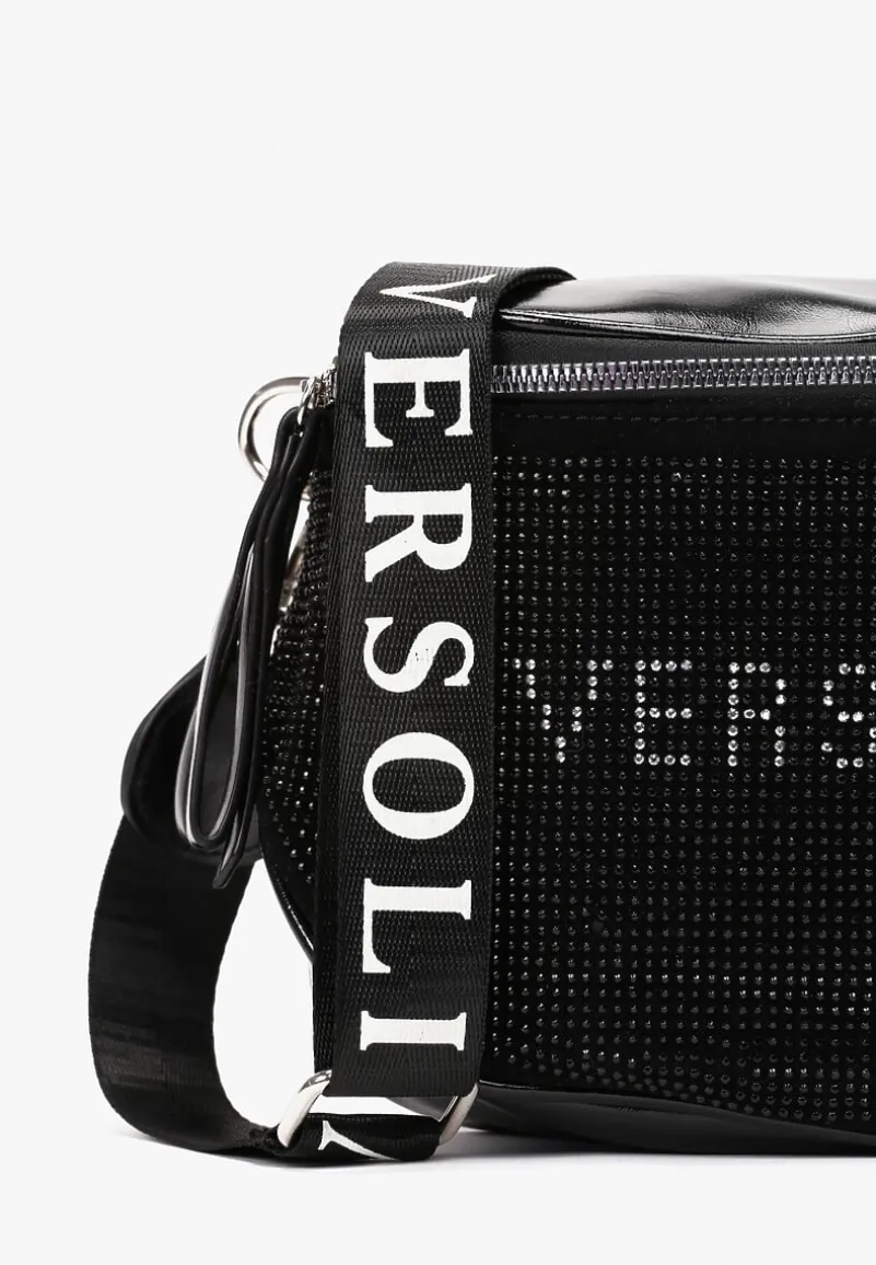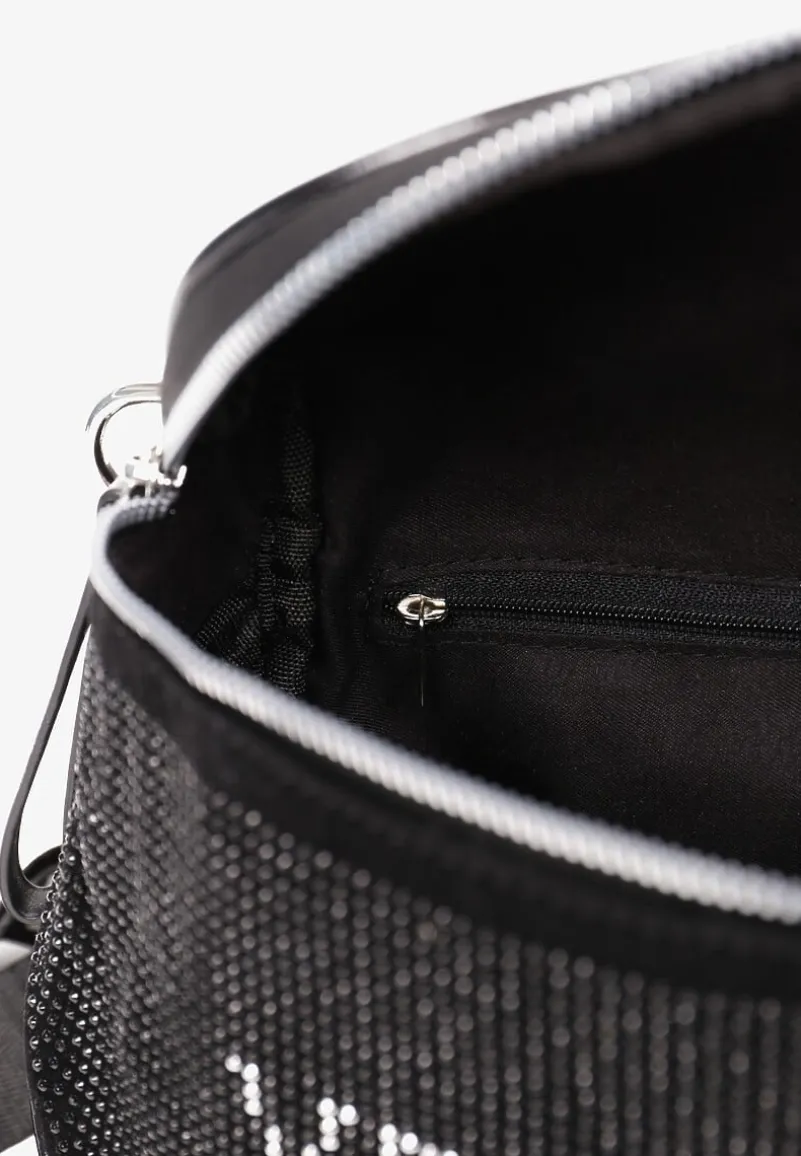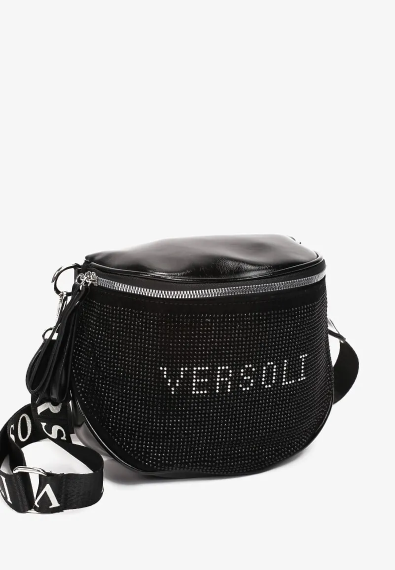 Nerka Vrol mała, o klasycznym kroju. Zapięcie w postaci zamka na krawędzi. Suwak zdobiony zawieszką z ekoskóry. Z materiałowym, regulowanym paskiem. Przód nerki zdobi imitacja drobnych cyrkonii i napis na środku. Wykonana z ekoskóry, nie pomieści formatu A4. Sprawdzi się w stylizacjach streetewarowych, casualowych i glam rock.