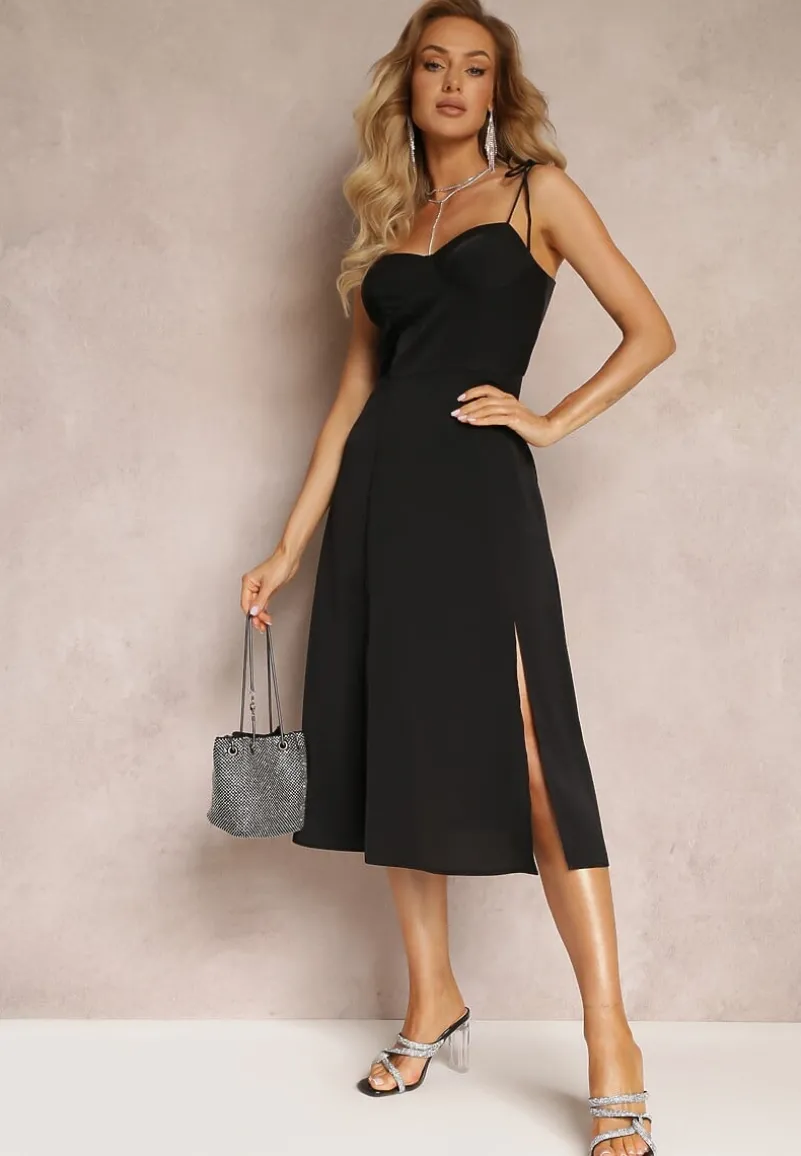 Czarna Rozkloszowana Sukienka Midi z Rozcięciem na Ramiączkach Josine