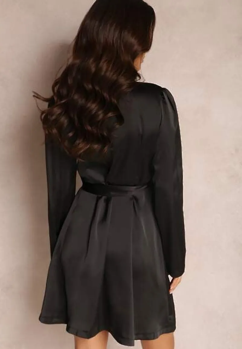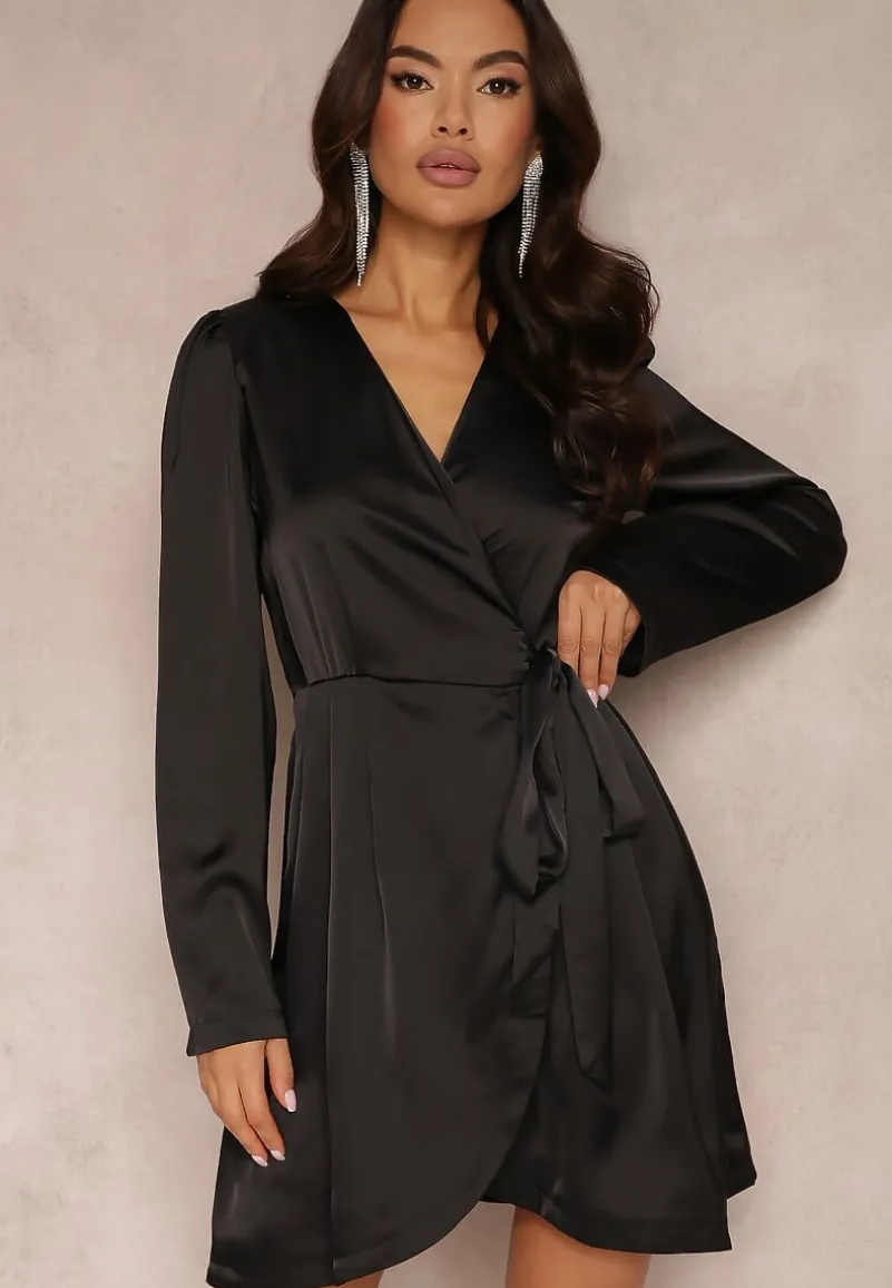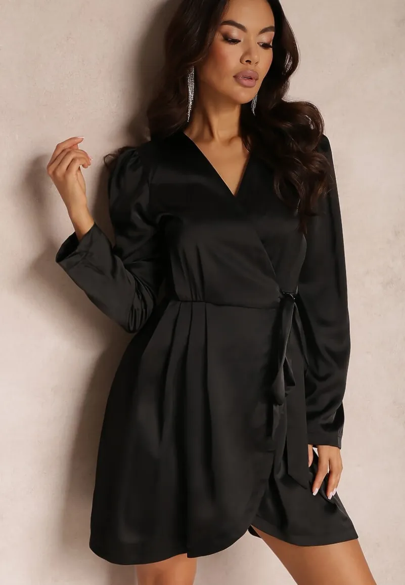 Sukienka Vinc satynowa, o modnym kopertowym fasonie z bufiastymi rękawami. Długość mini, w talii satynowy, wiązany pasek. Bez podszewki.