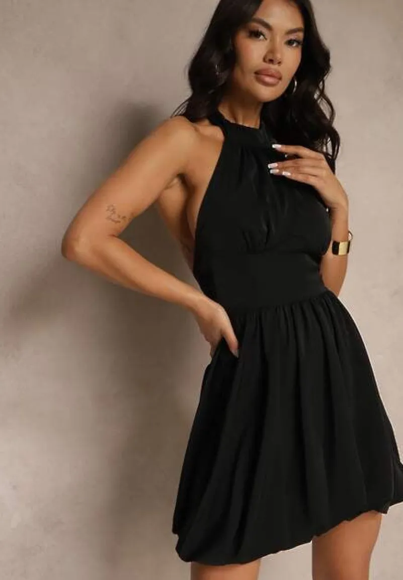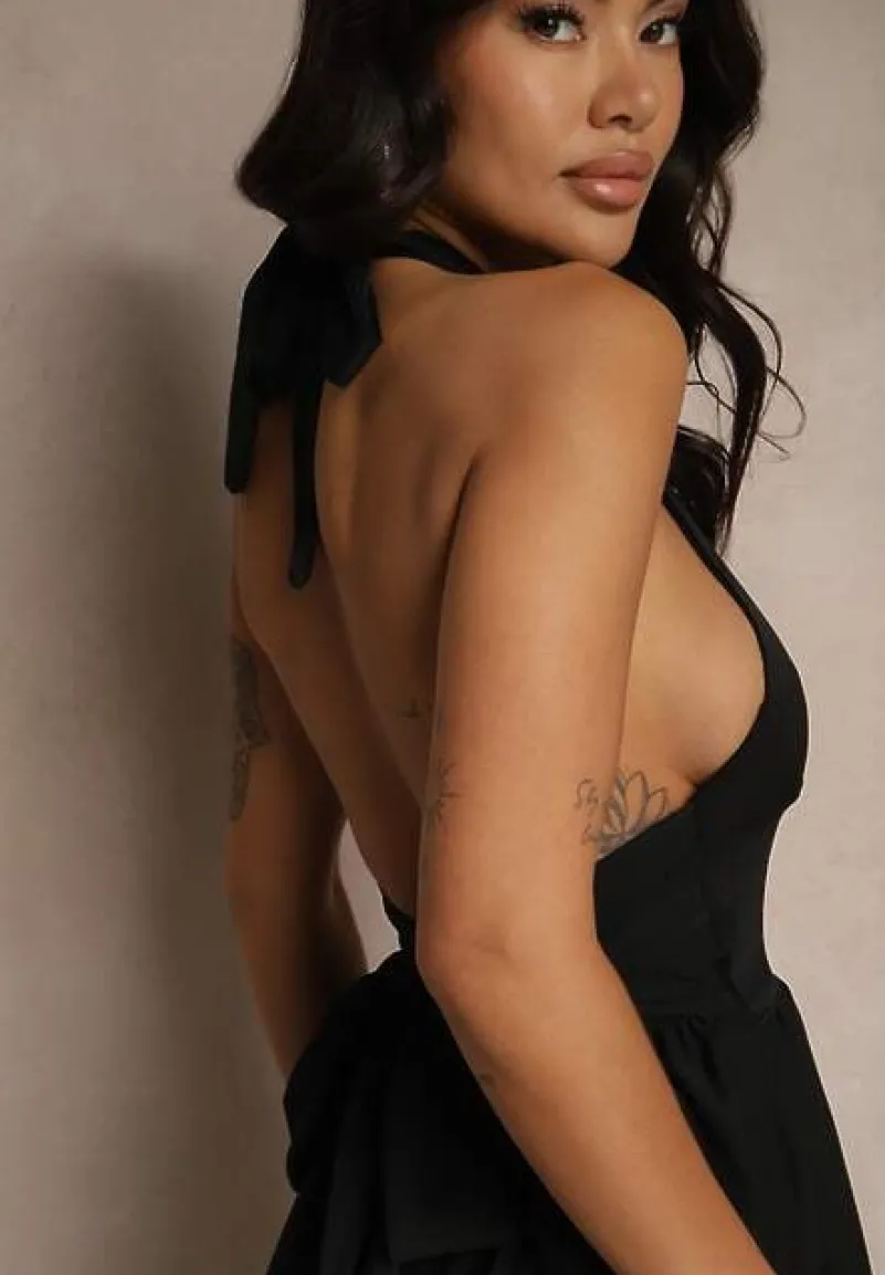 Czarna Sukienka Bombka z Dekoltem Halter i Ozdobnym Wiązaniem Alanivia