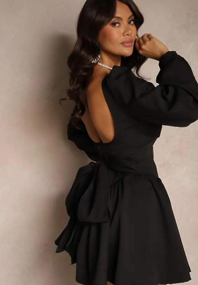 Czarna Sukienka Gorsetowa z Rozkloszowanym Dołem i Luźnymi Rękawami Wiązana z Tyłu Enariel