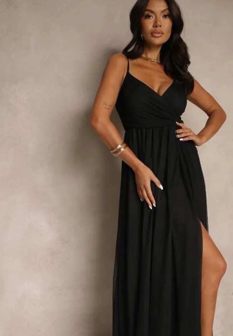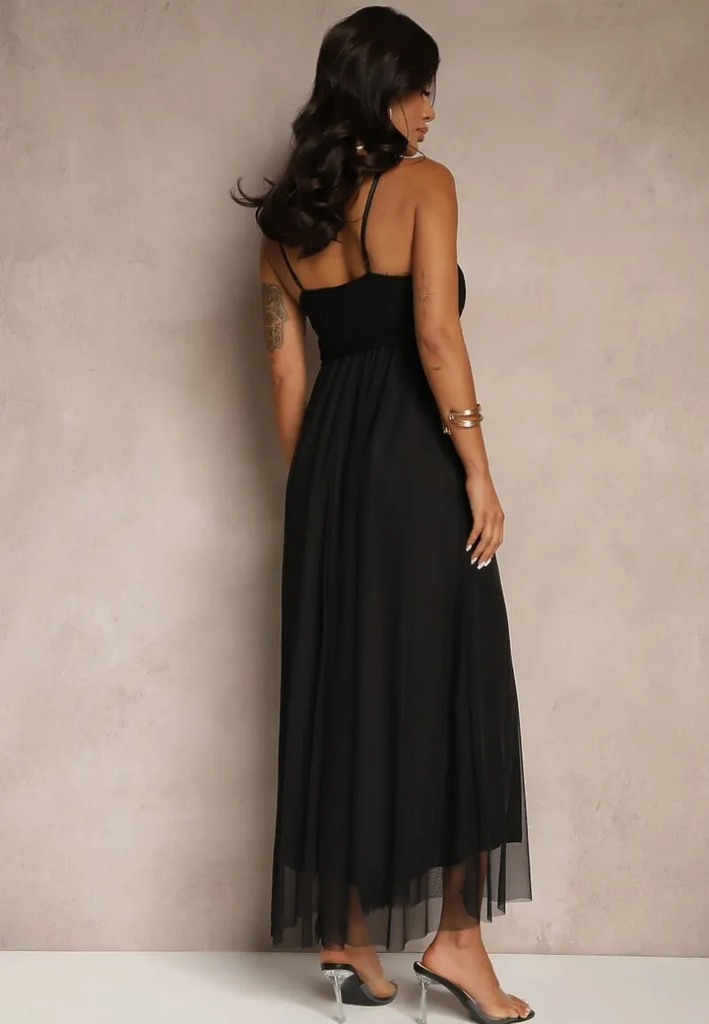 Czarna Sukienka Koktajlowa Ozdobiona Tiulowym Materiałem Deviora