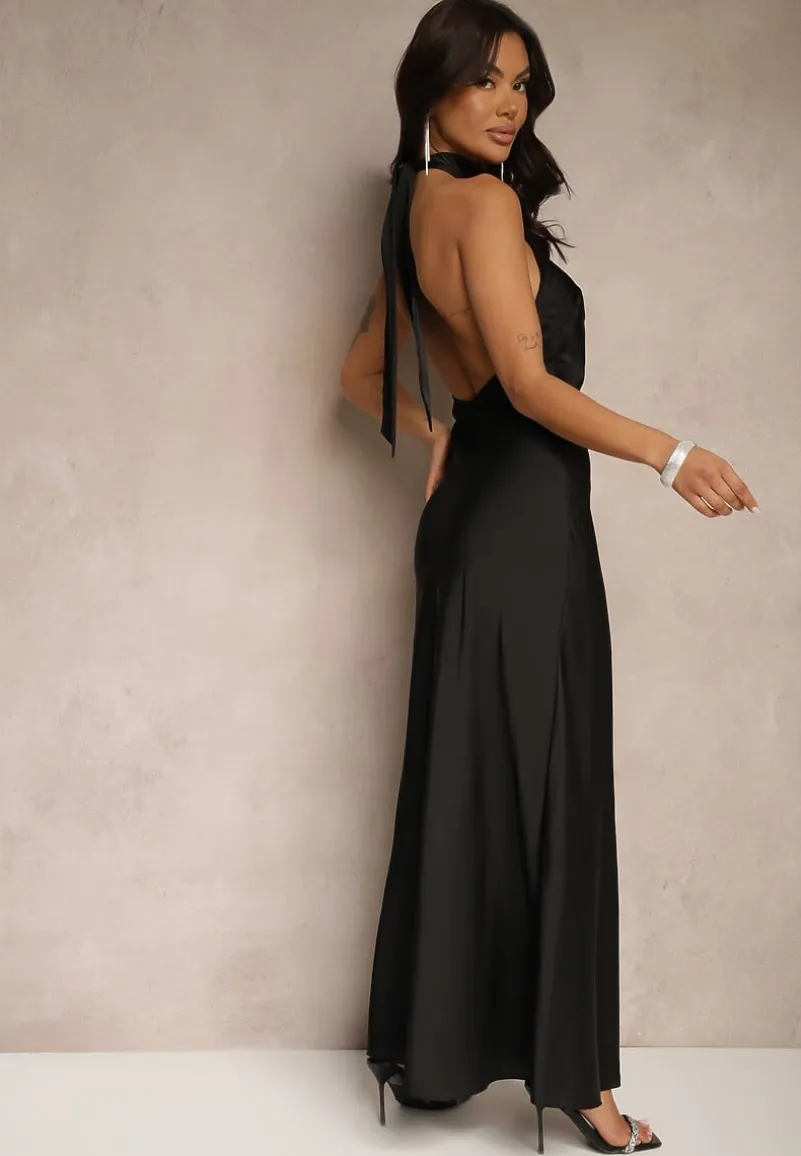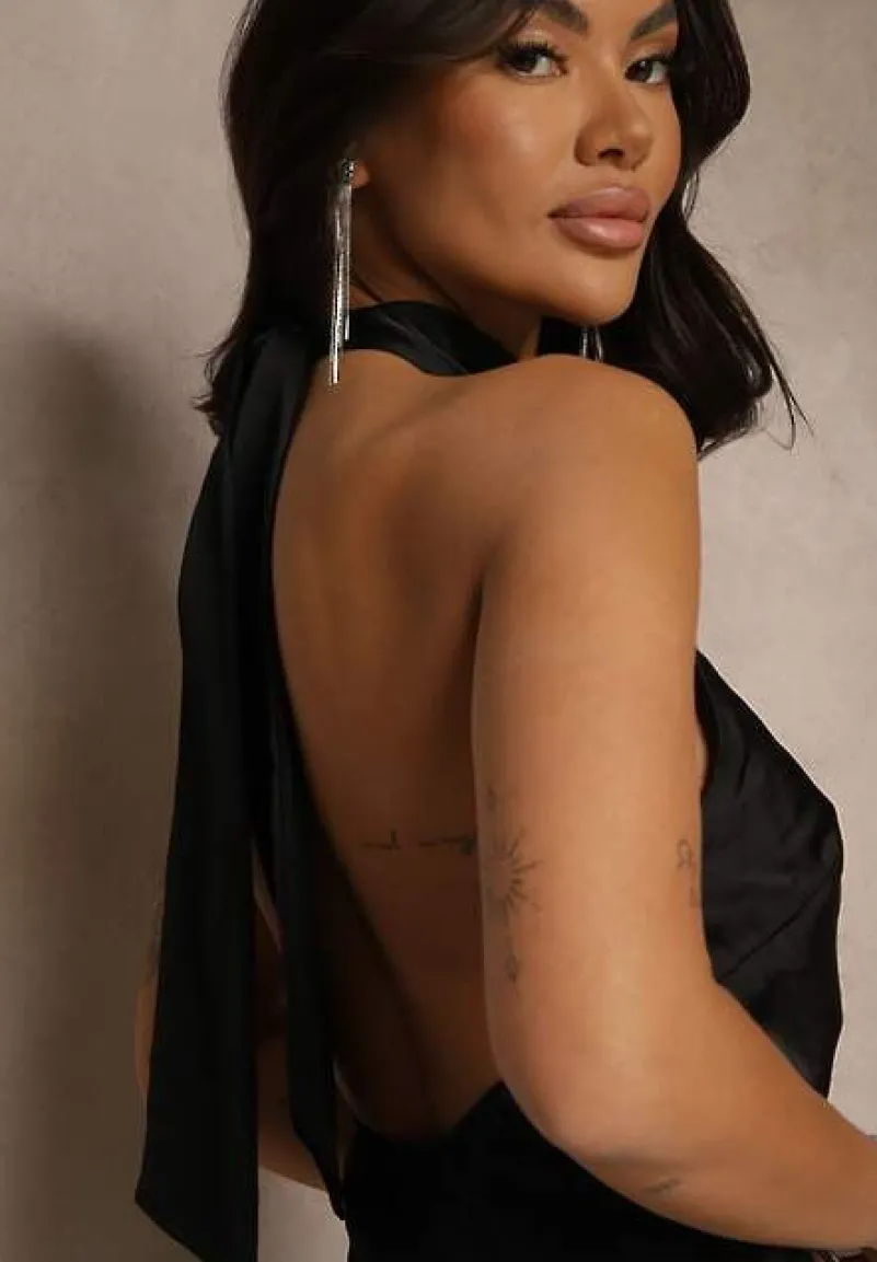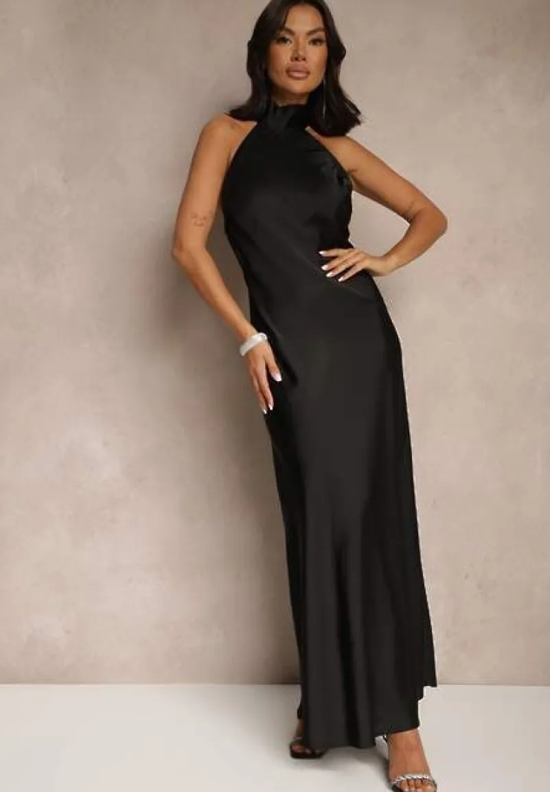 Czarna Sukienka Satynowa z Dekoltem Halter i Odkrytymi Plecami Belas