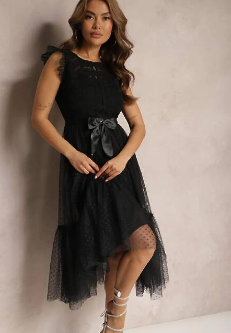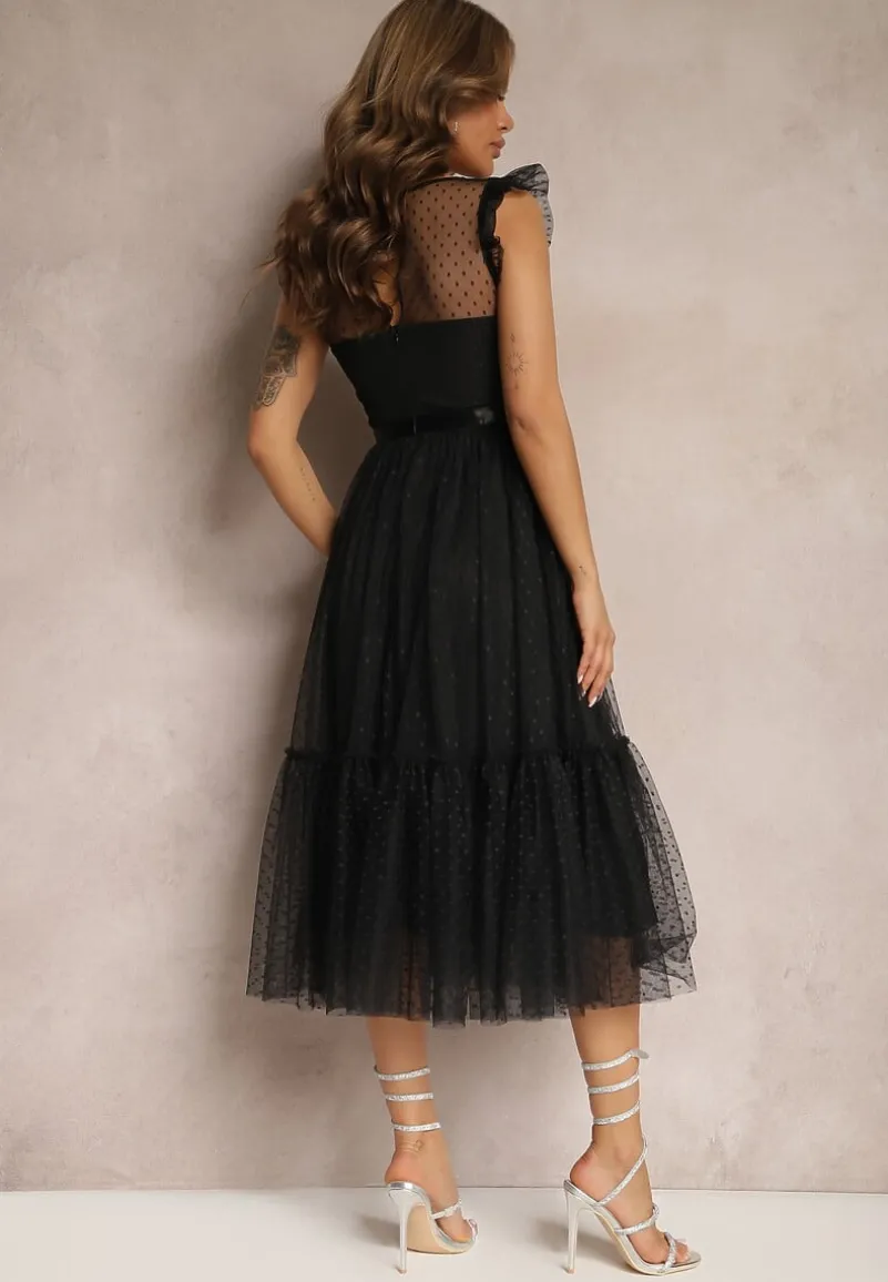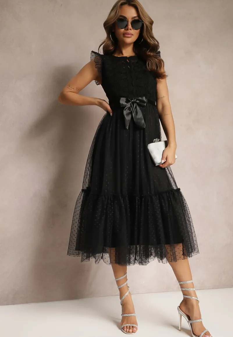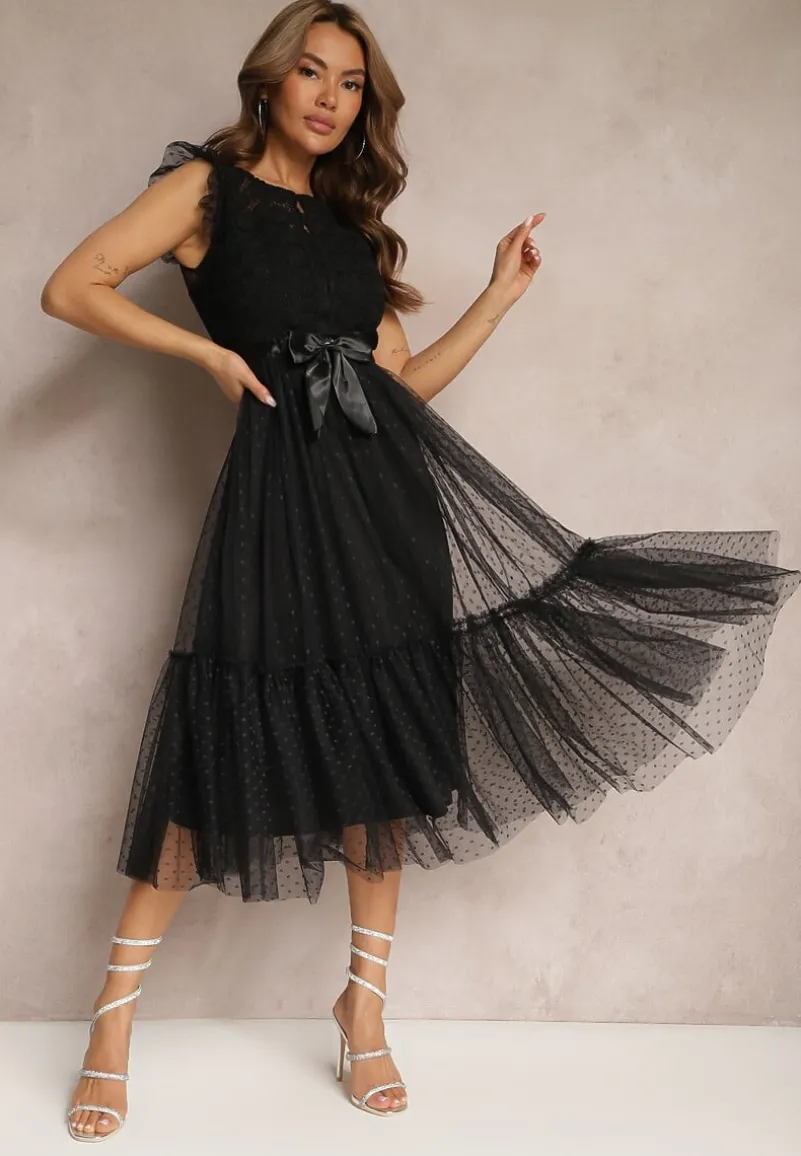 Czarna Taliowana Sukienka z Tiulową Spódnicą i Górą z Koronki Darela