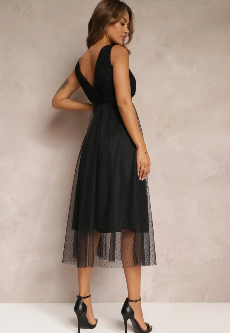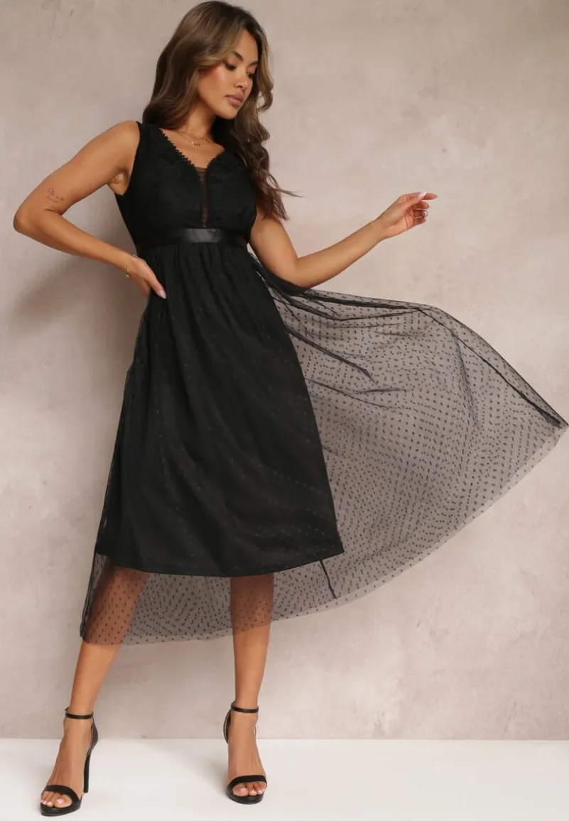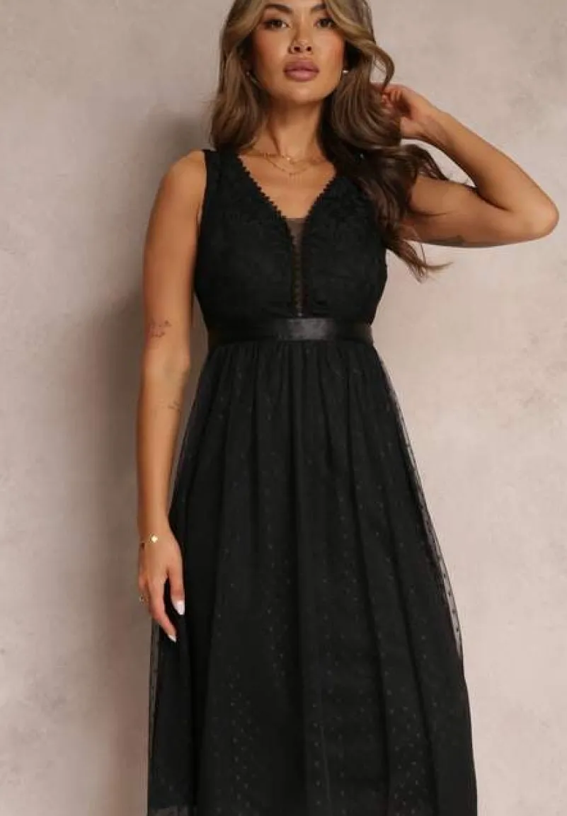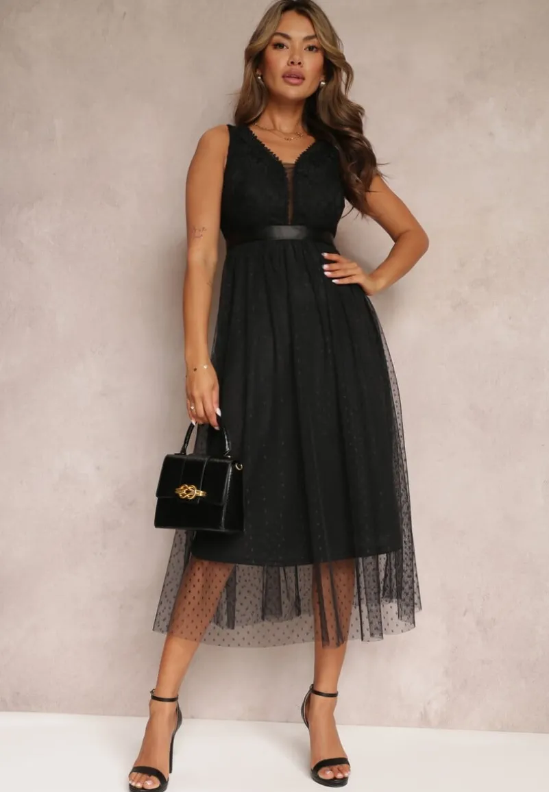 Czarna Tiulowa Sukienka Rozkloszowana z Koronką Phyvana