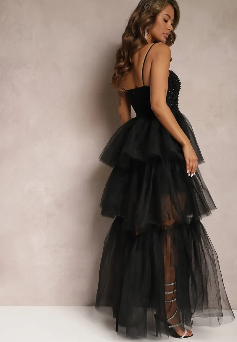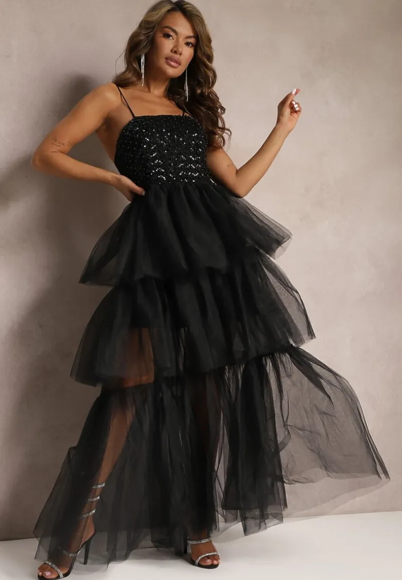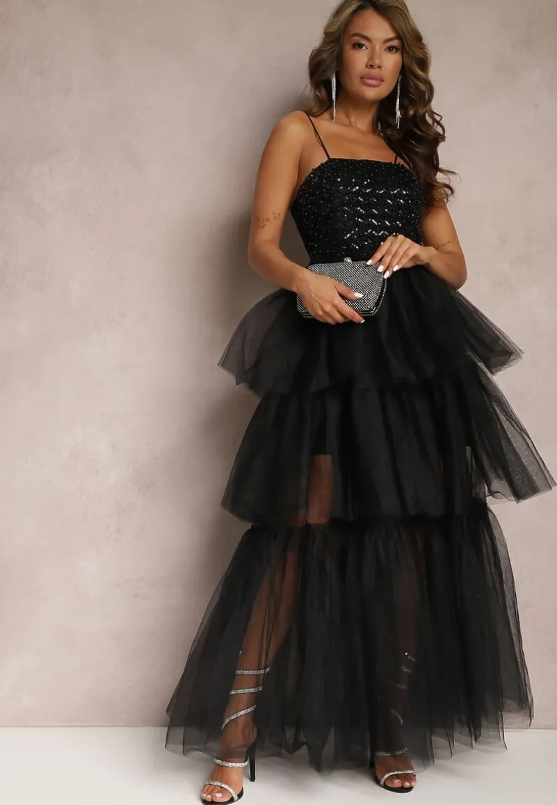 Czarna Wieczorowa Sukienka Maxi Ozdobiona Cekinami i Falbankami z Tiulu Neptina