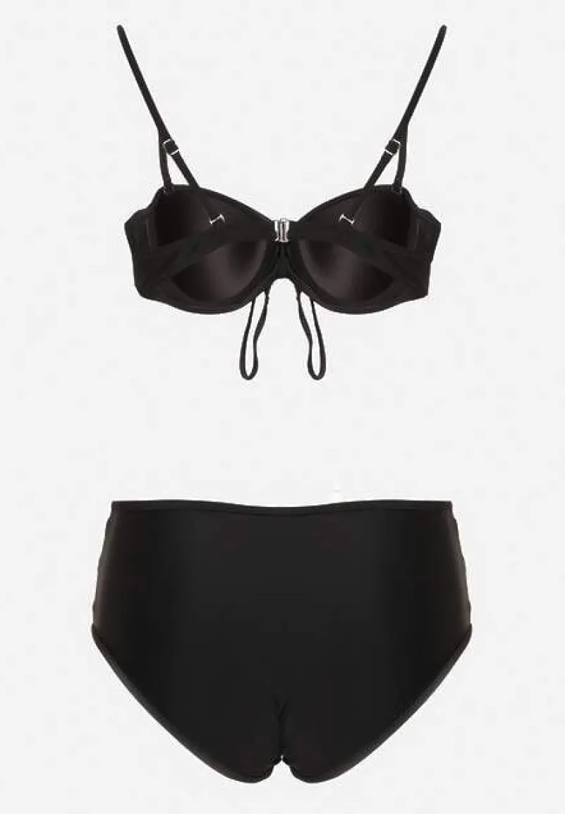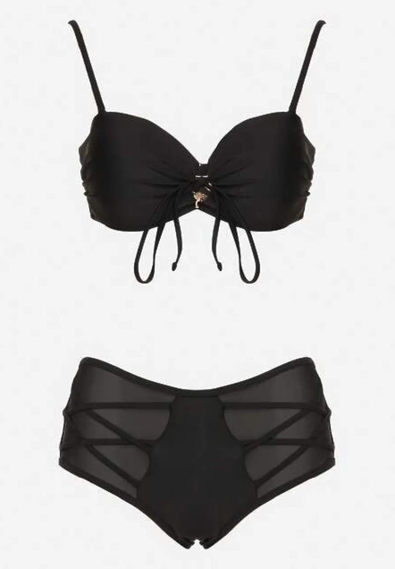 Czarne Bikini Biustonosz i Majtki Figi High Waist z Siateczkowymi Zdobieniami Kinovia
