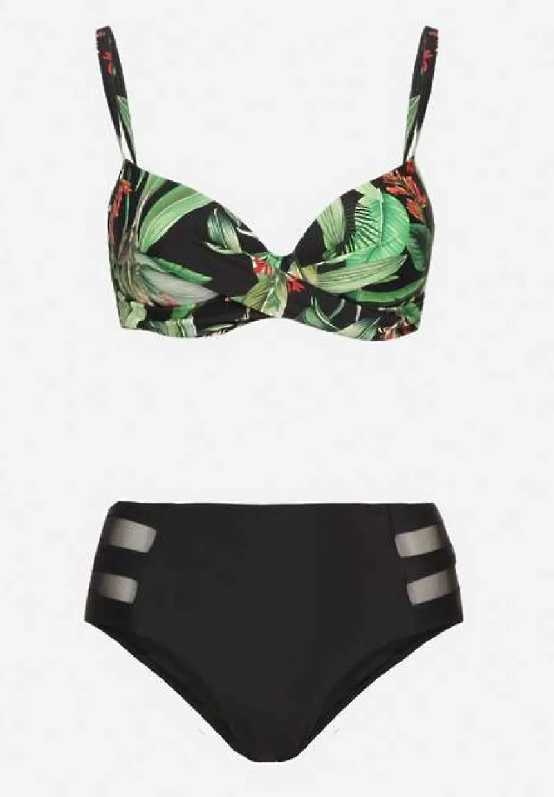 Czarne Bikini Biustonosz w Liście i Majtki Figi z Siateczkowymi Wstawkami Kinalea