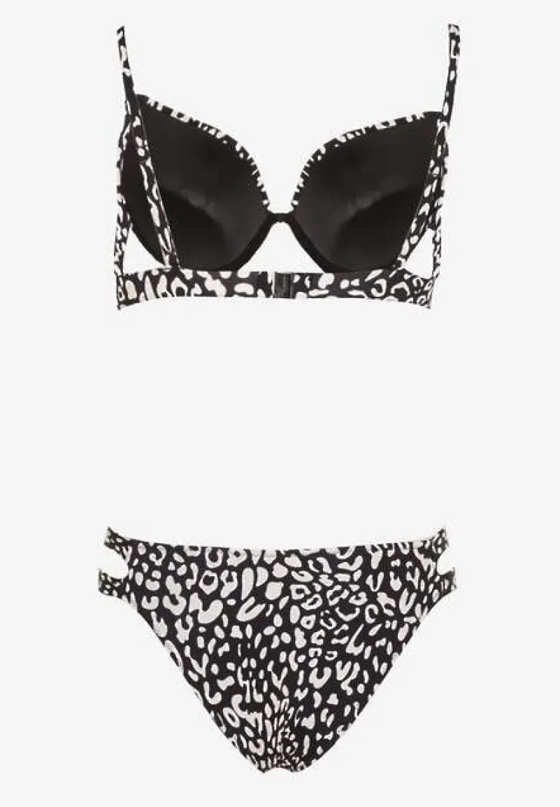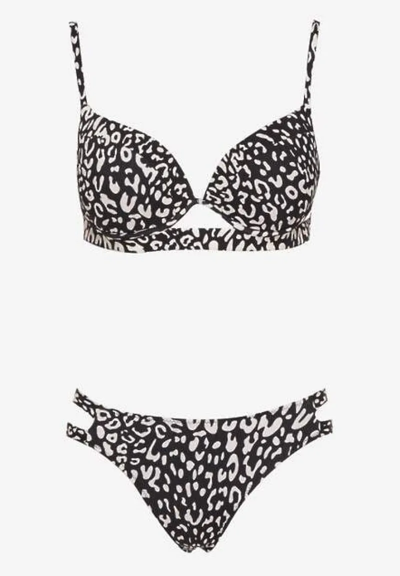 Czarne Bikini w Panterkowy Wzór Biustonosz i Majtki Figi Zdobione Wycięciami Savrienne