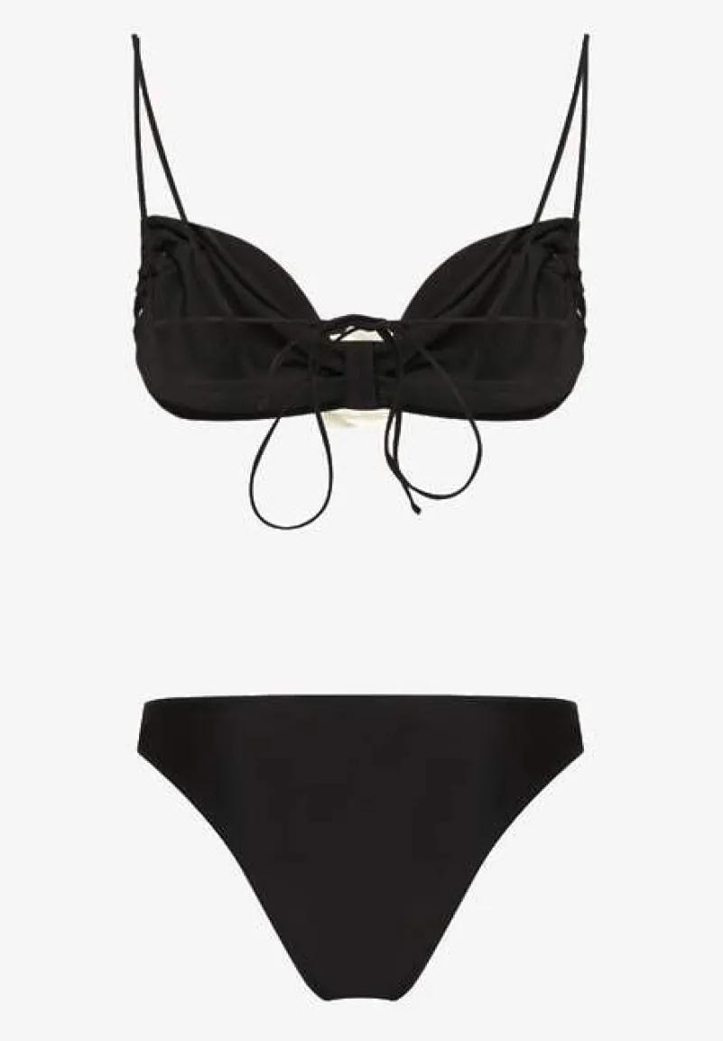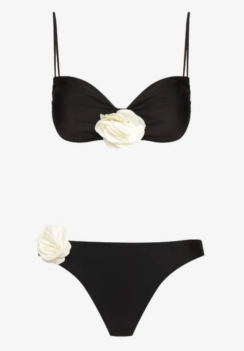 Czarne Bikini z Wiązaną Górą Ozdobione Kwiatowymi Aplikacjami Rivashan