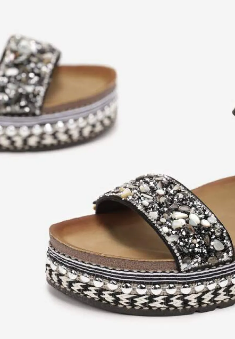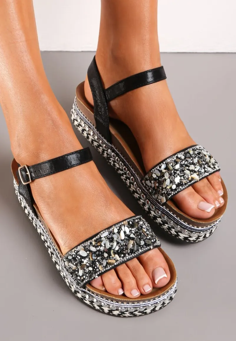 Sandały Yohella w stylu boho na platformie ozdobionej nitami i plecionką. Z przodu ozdobny pasek z cyrkoniami i kamyczkami.