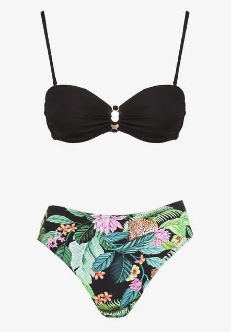 Zapewnij sobie stylowy wygląd na plaży dzięki bikini Natorea, które łączy w sobie modny fason i efektowne metaliczne aplikacje. Wzór na figach doskonale podkreśla kobiece kształty, a błyskotliwe detale na biustonoszu na regulowanych, odpinanych ramiączkach z usztywnianymi miseczkami, wiązanym z tyłu na plecach dodają charakteru Twojej stylizacji. To idealny wybór zarówno na słoneczne dni na plaży, jak i na modowe festiwale, gdzie chcesz zabłysnąć! Połącz bikini z oversize’ową koszulą i kapeluszem na plażę. Obwód pod biustem; 38 – 102 cm, 40 – 106 cm, 42 – 108 cm, 44 – 109 cm, 46 – 115 cm.