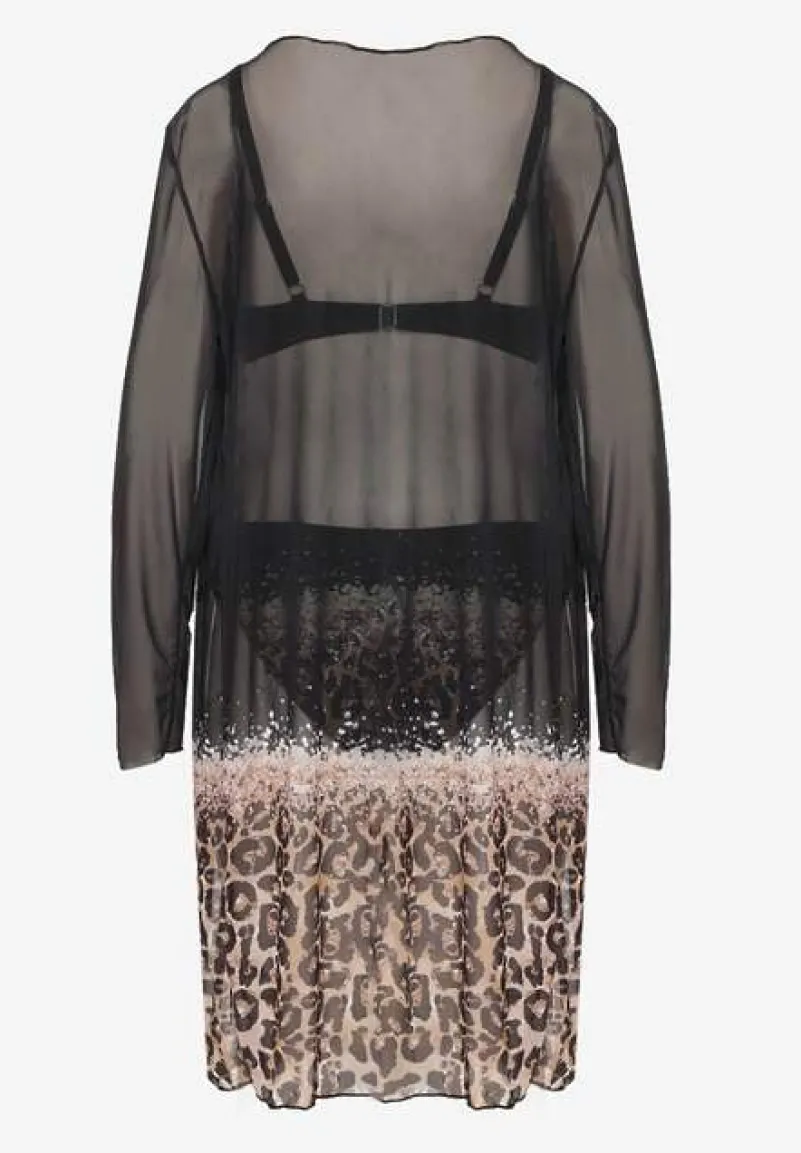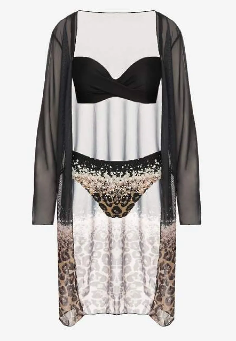 Czarny Komplet Bikini Majtki Figi Biustonosz i Narzutka w Panterkę Paselina