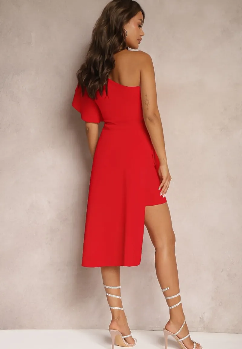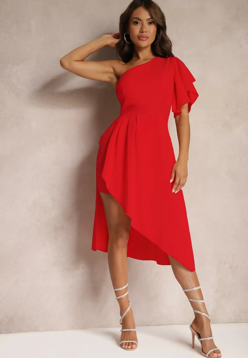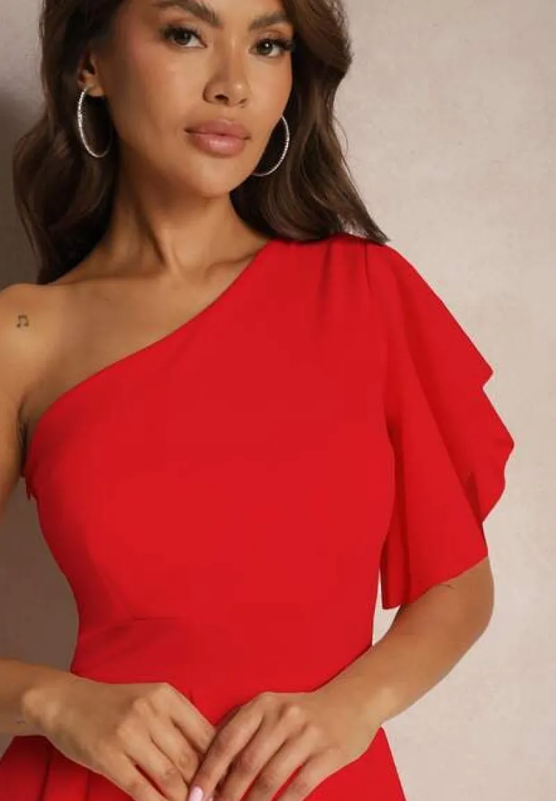 Czerwona Asymetryczna Sukienka Wieczorowa na Jedno Ramię Ozdobiona Falbankami Vimasira