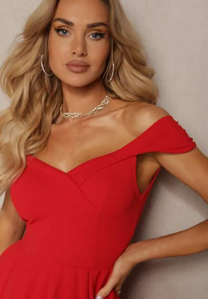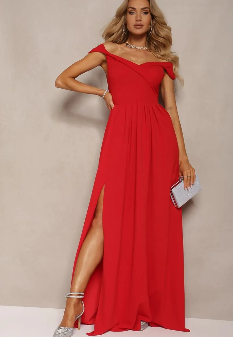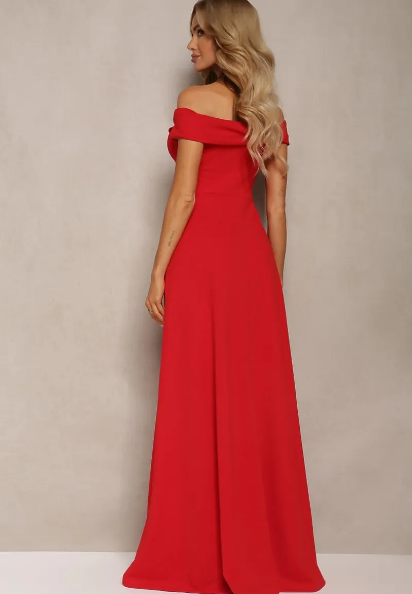 Czerwona Elegancka Długa Sukienka Hiszpanka Wykończona Rozcięciem na Dole Idelia
