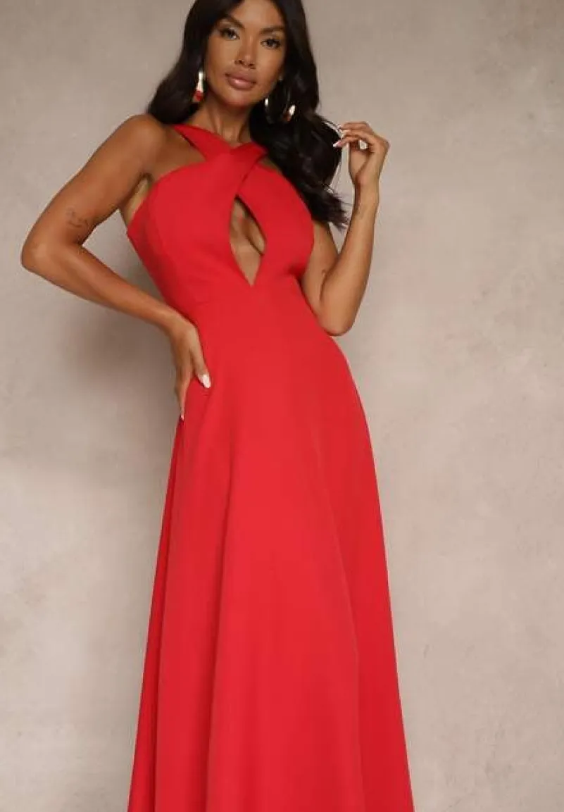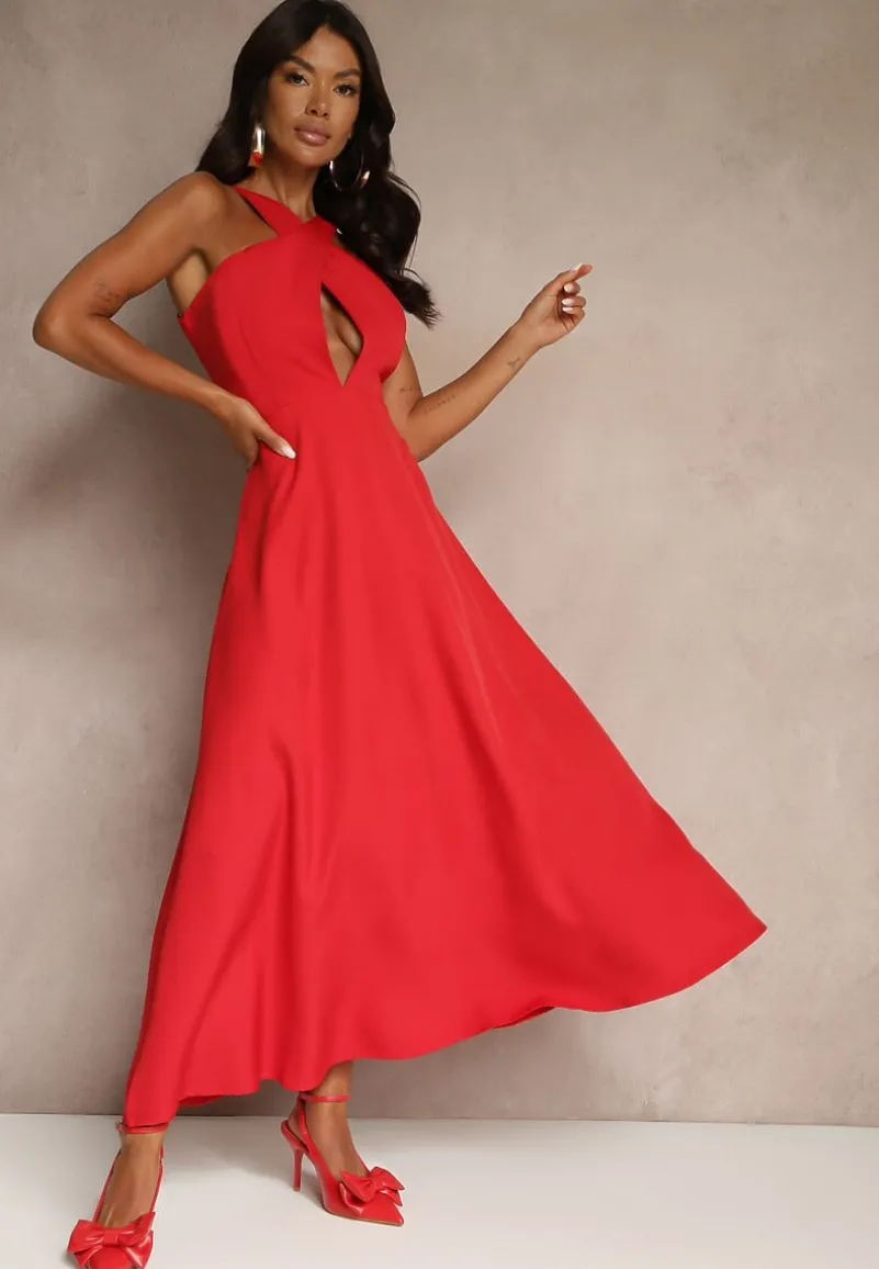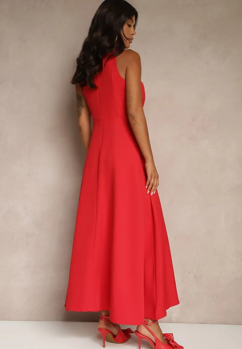 Czerwona Koktajlowa Sukienka z Wiskozą i Dekoltem Halter Dolmanna