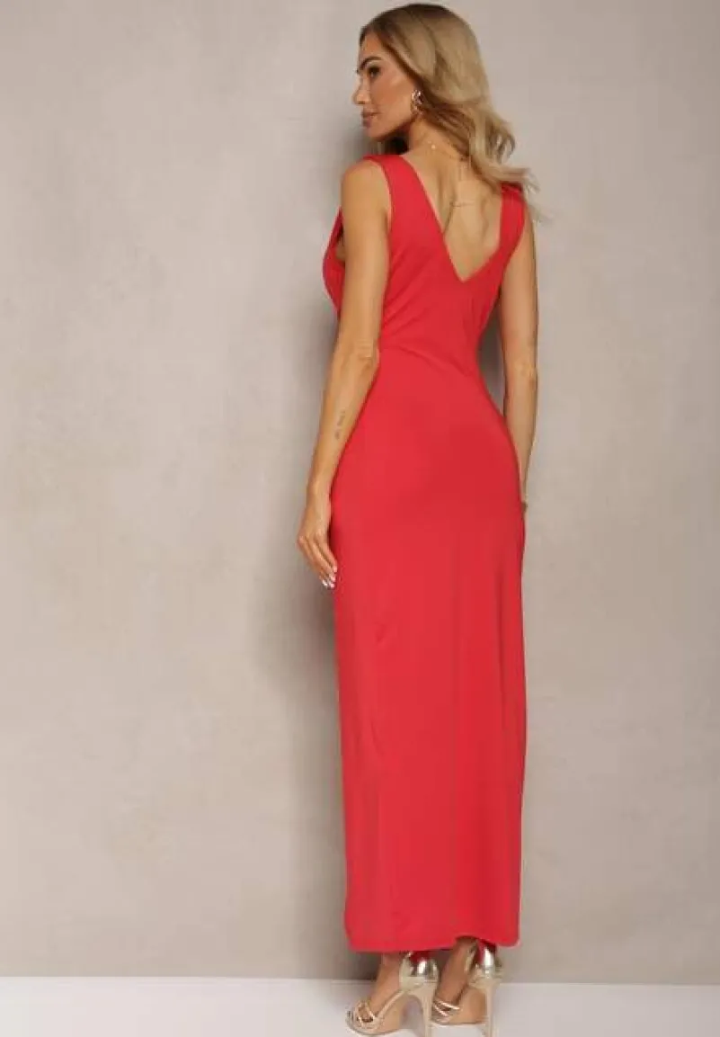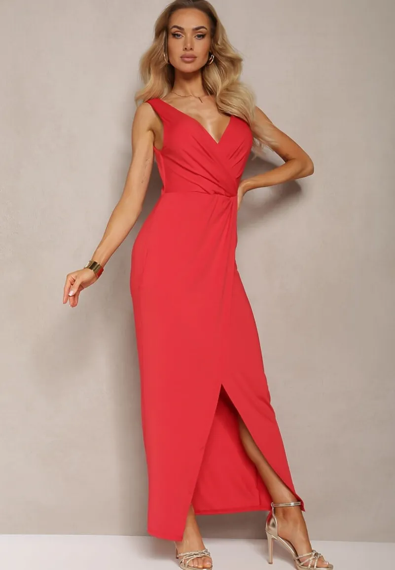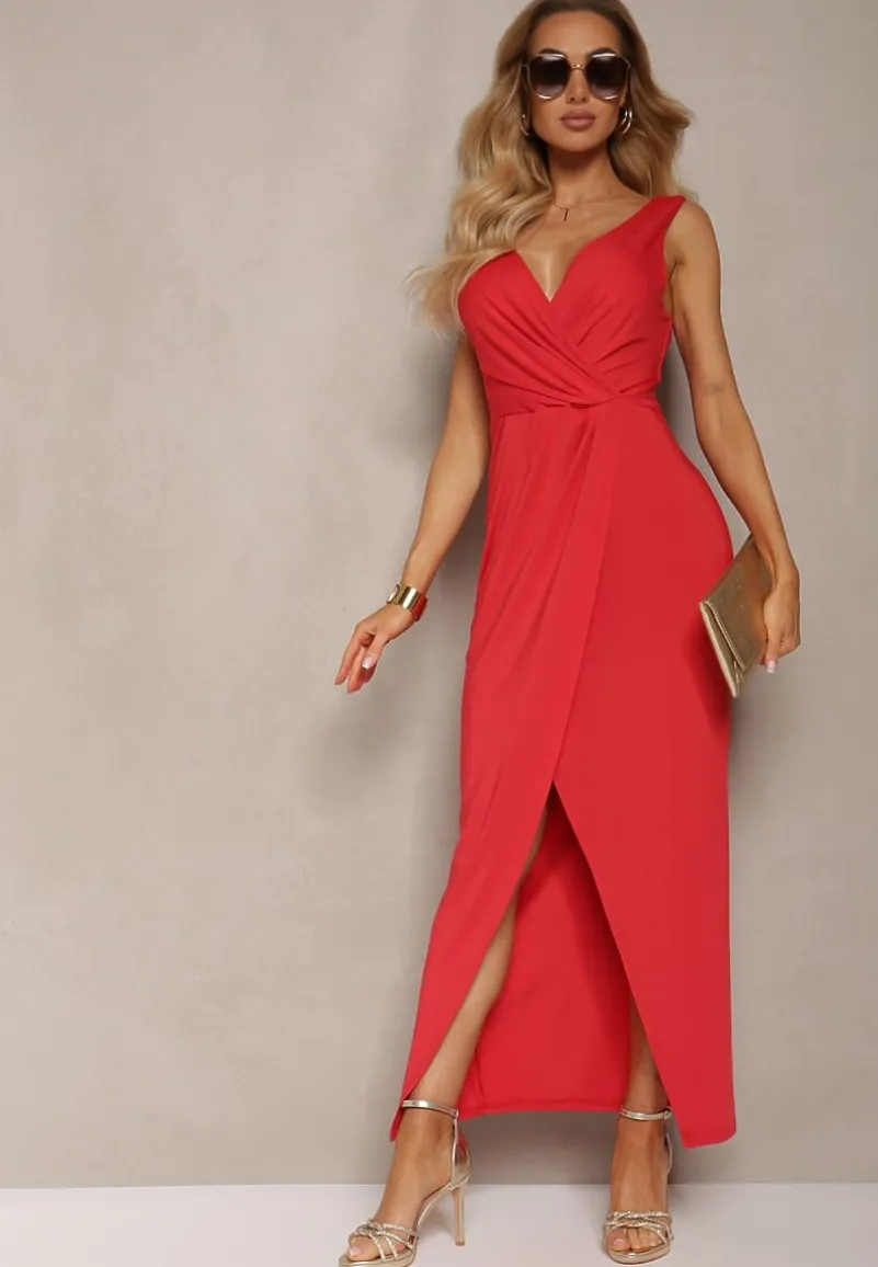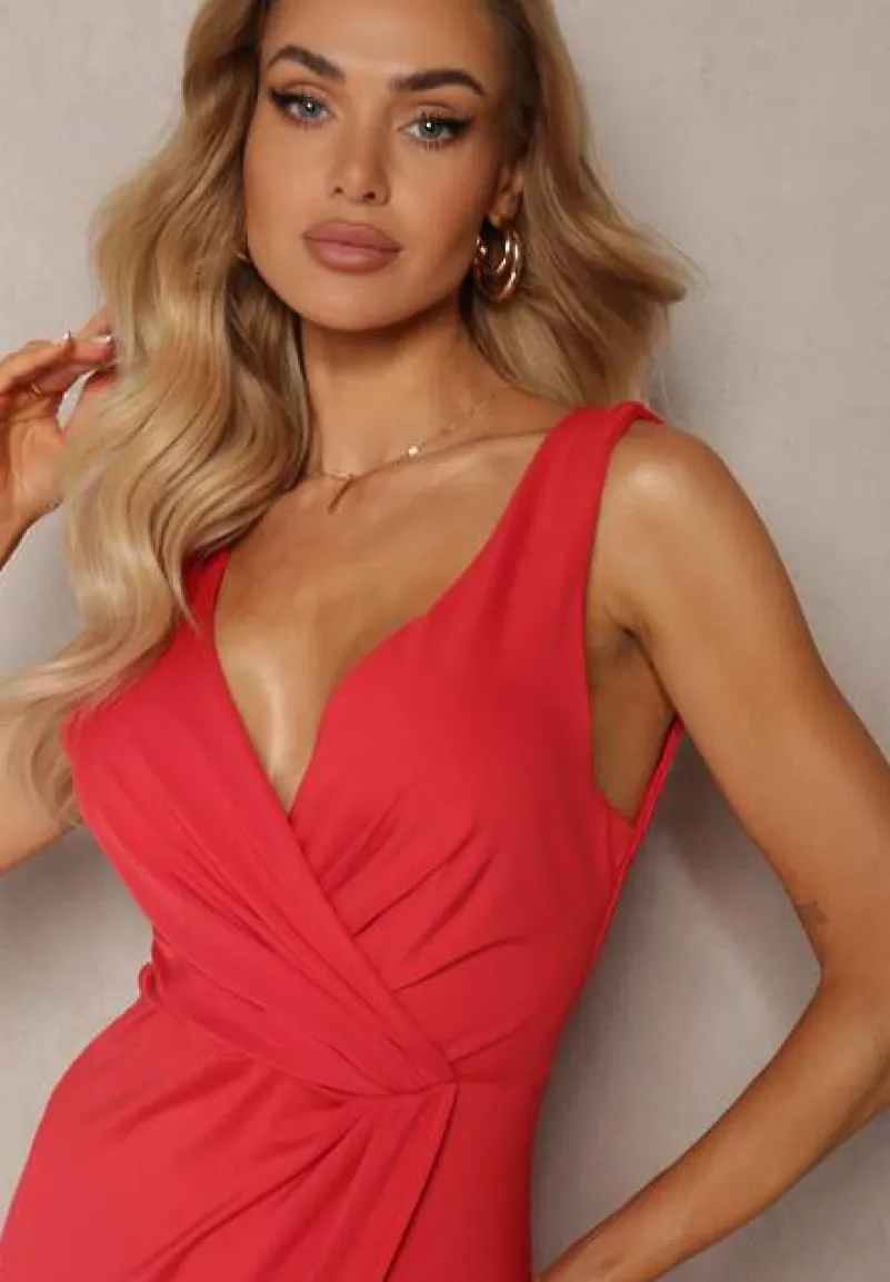 Czerwona Kopertowa Sukienka w Koktajlowym Stylu z MarszczeniemKalkisa