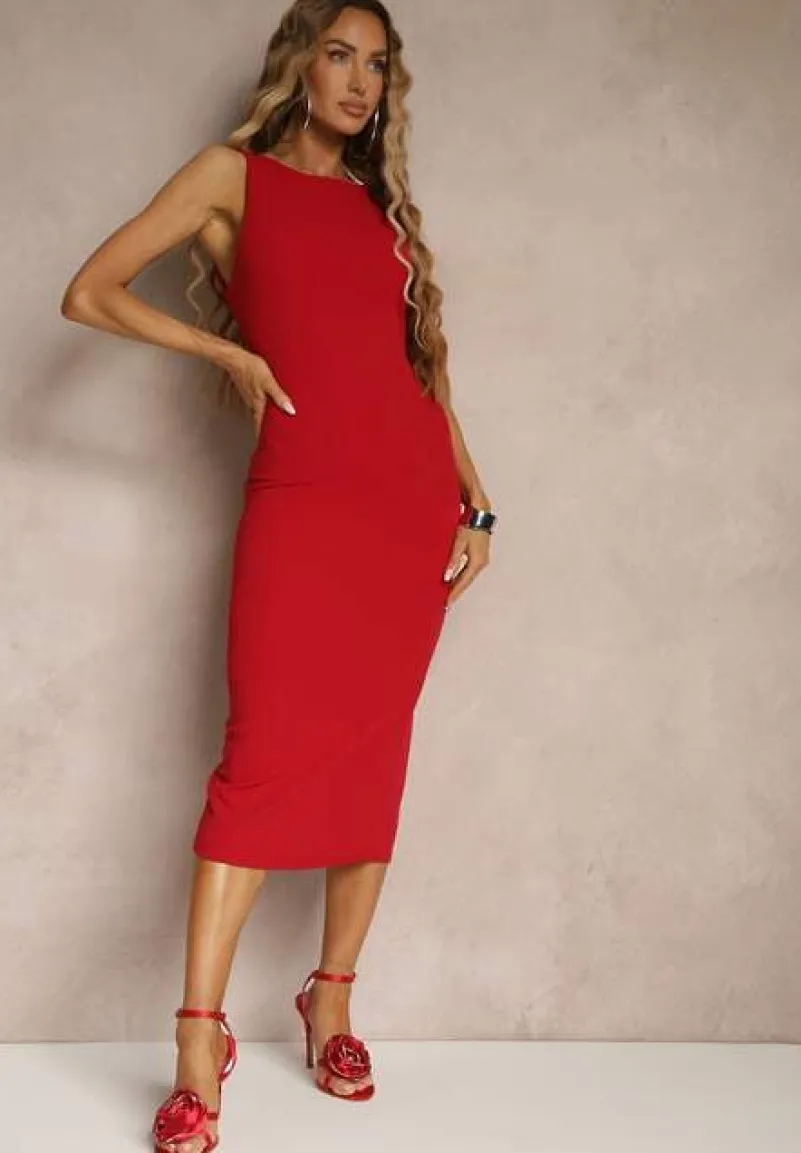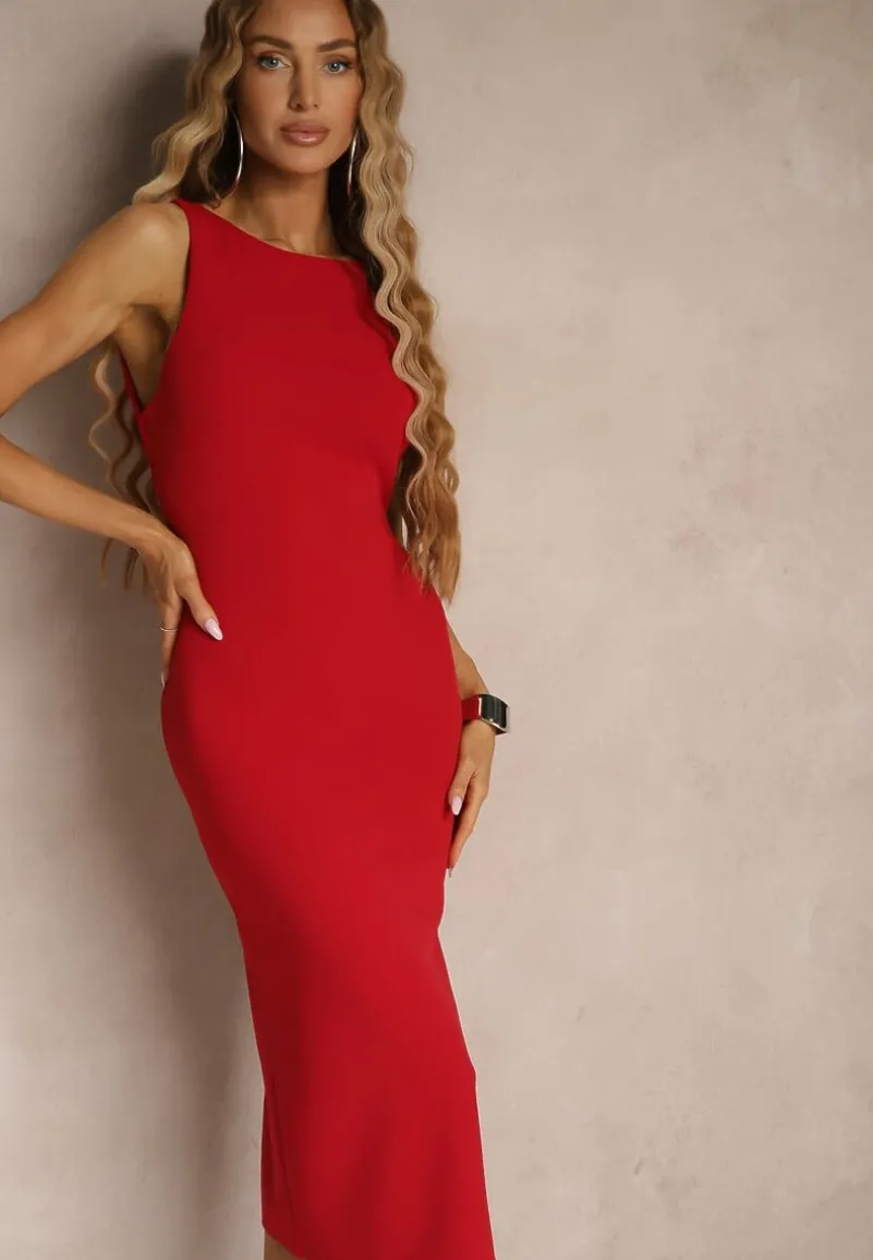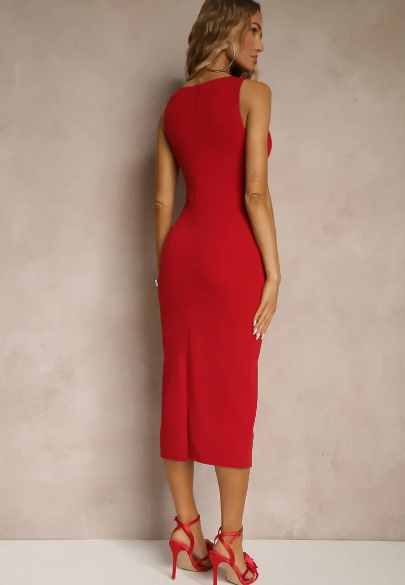 Czerwona Ołówkowa Sukienka Bez Rękawów z Wiskozą Zdobiona Rozcięciem z Tyłu Fonama