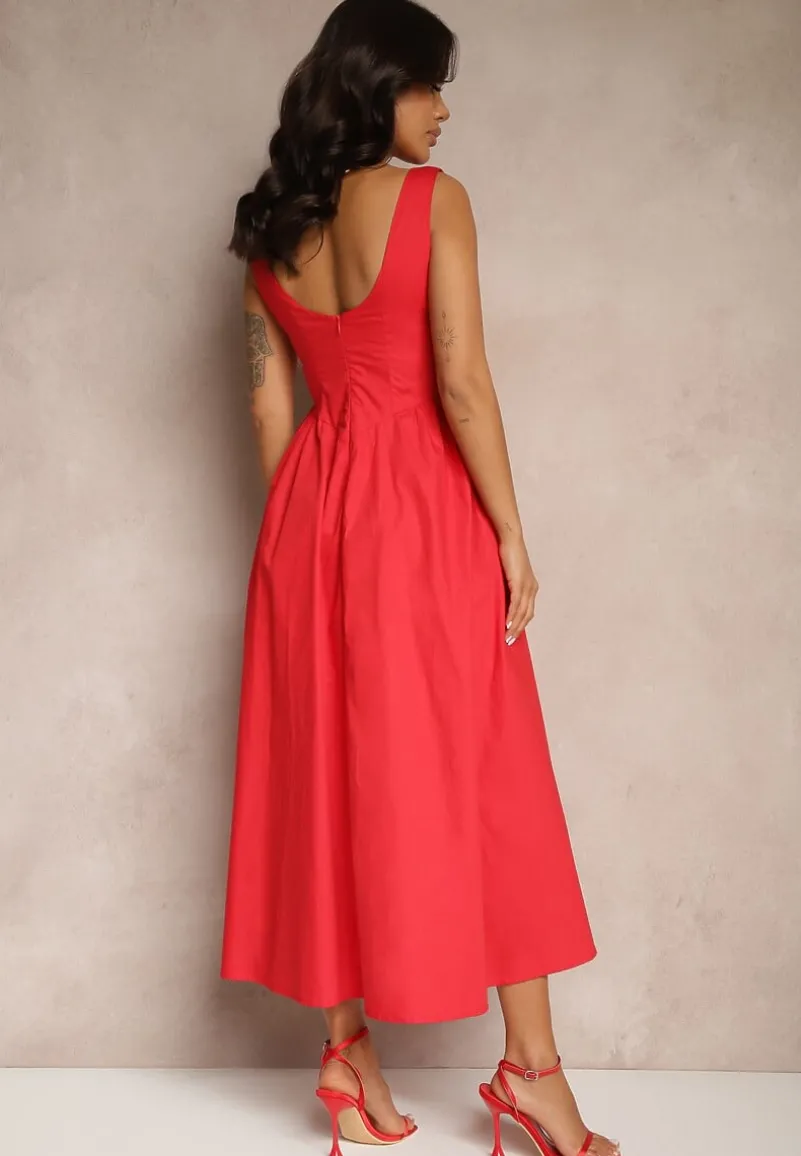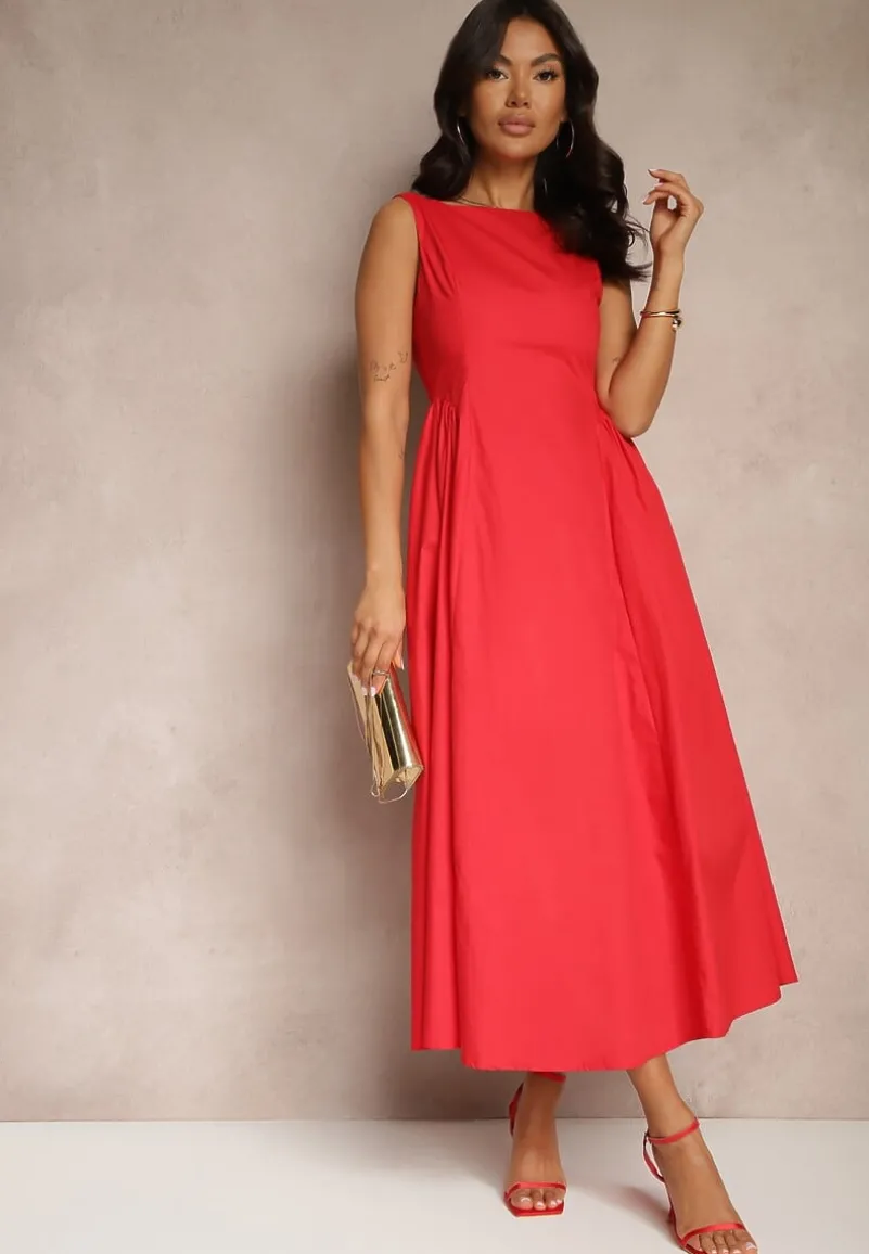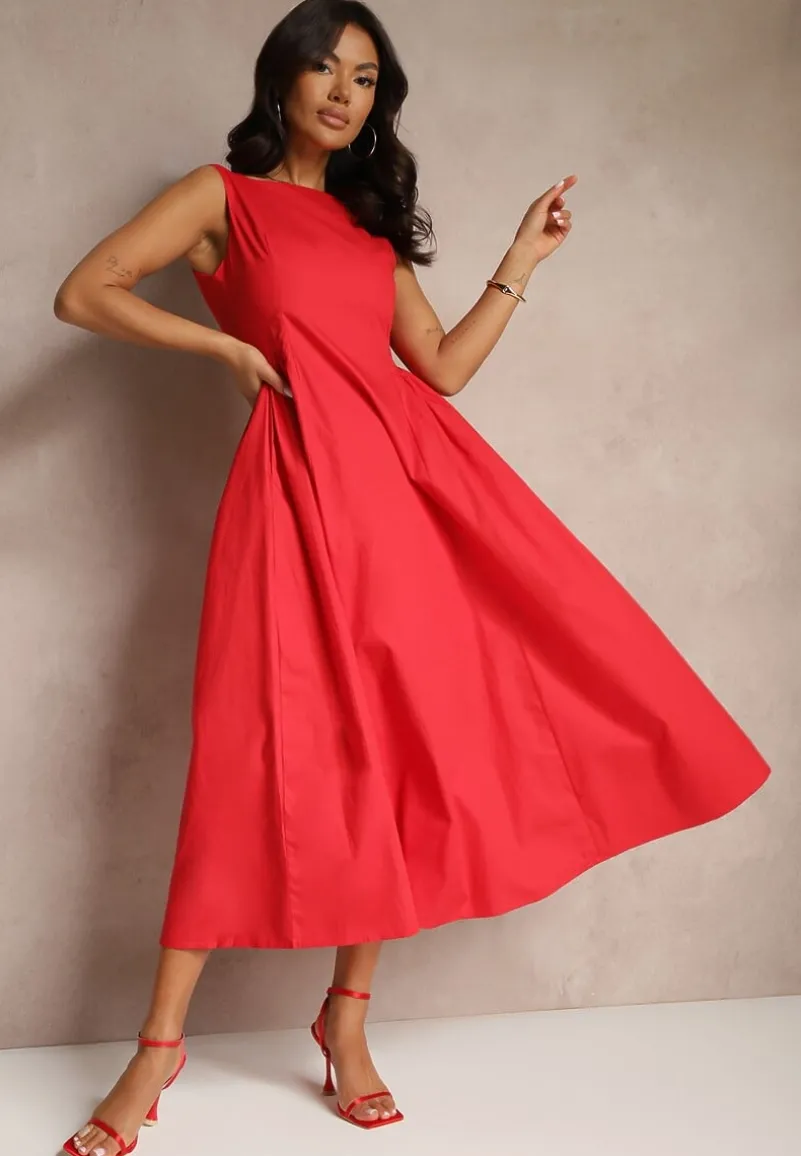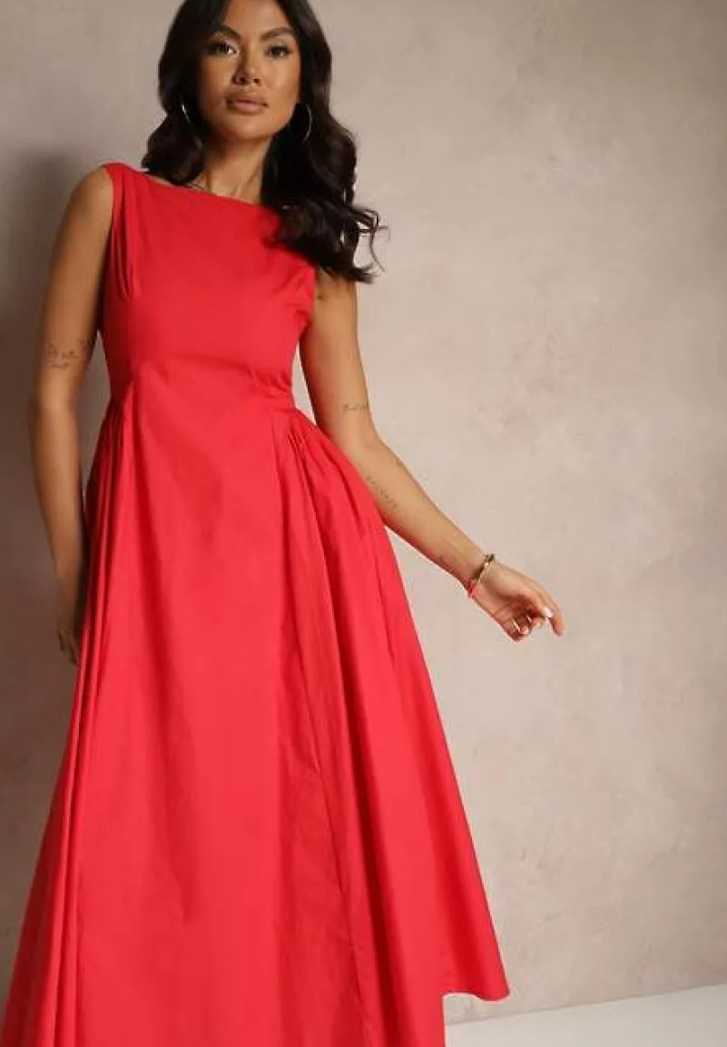 Czerwona Rozkloszowana Sukienka Koktajlowa z Bawełny z Dekoltem Łódką i Kieszeniami Fanilra