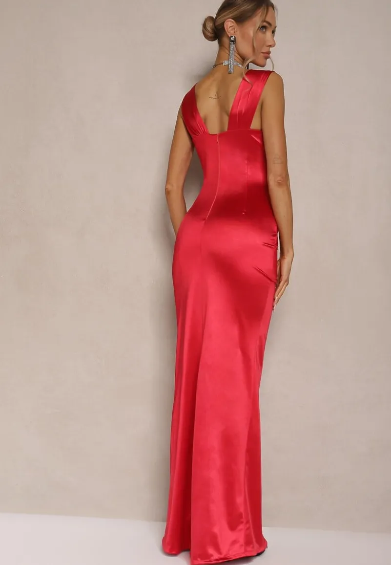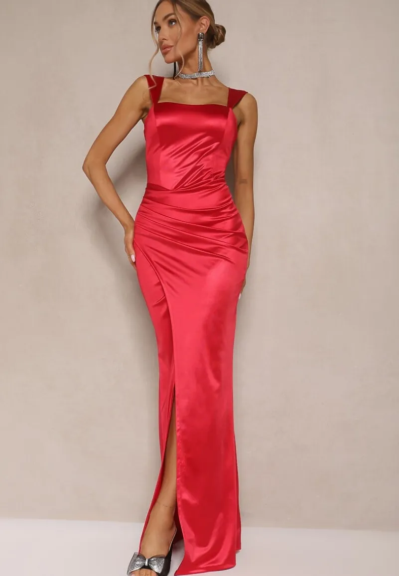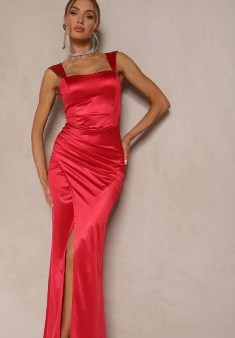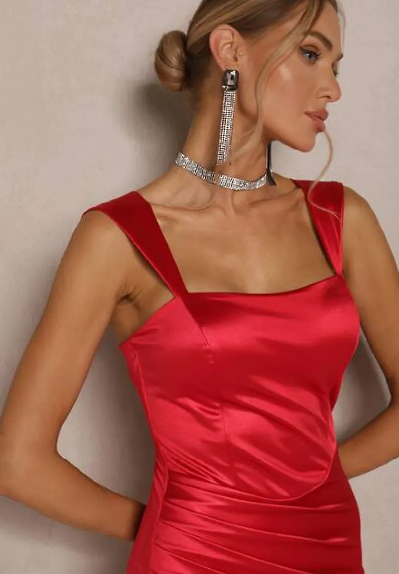 Czerwona Satynowa Sukienka z Marszczeniem na Ramiączkach o Dopasowanym Kroju Lisarionea