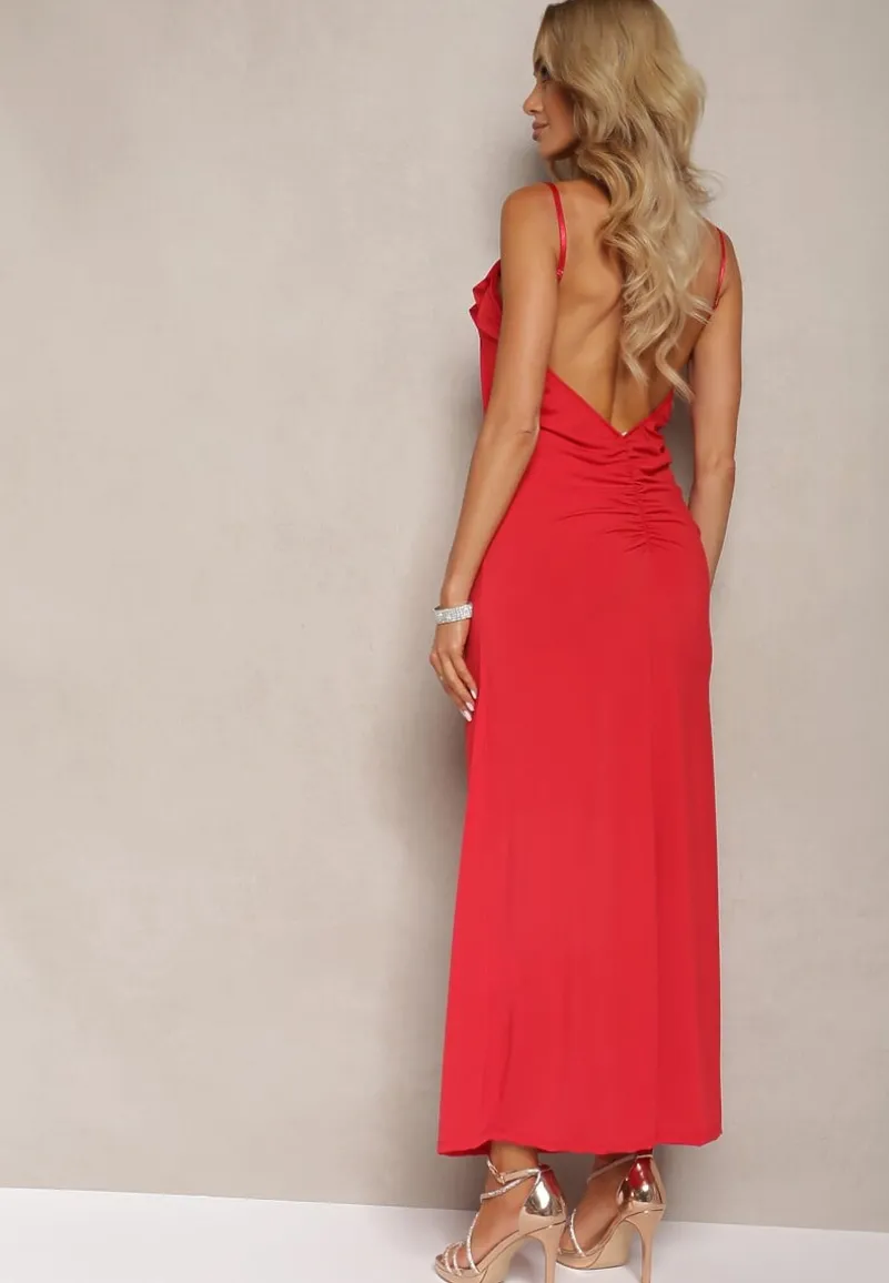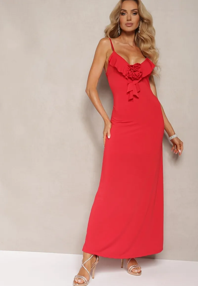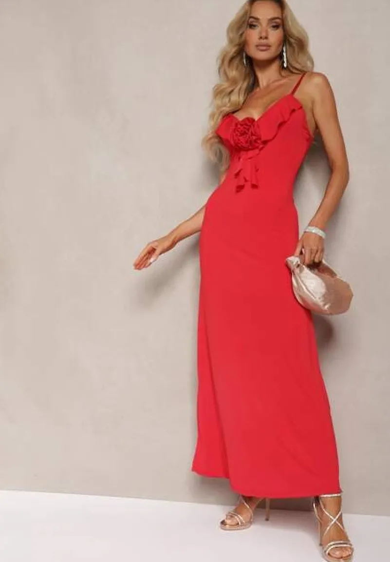 Czerwona Sukienka Koktajlowa o Dopasowanym Kroju z Ozdobną Broszką Kwiatkiem i Falbaną Vikassa