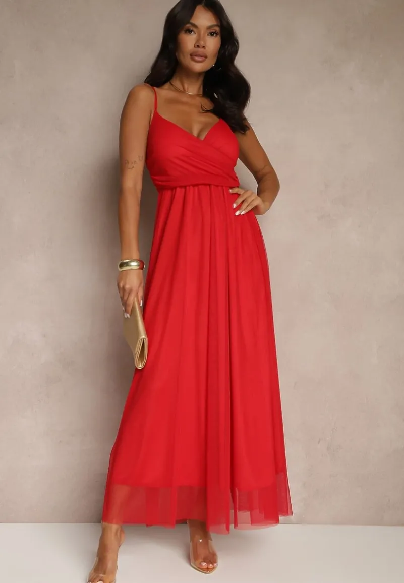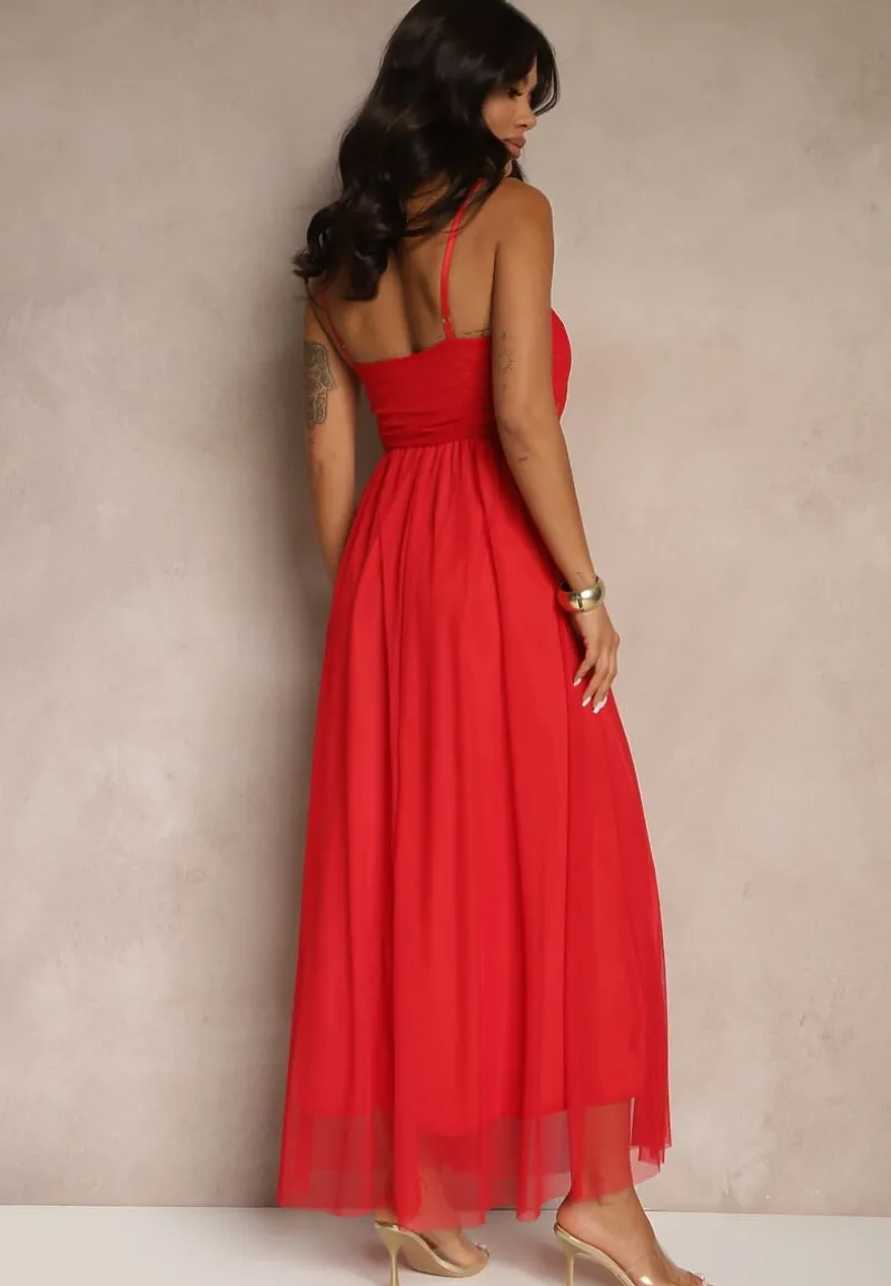 Czerwona Sukienka Koktajlowa Ozdobiona Tiulowym Materiałem Deviora