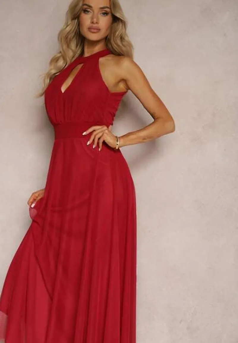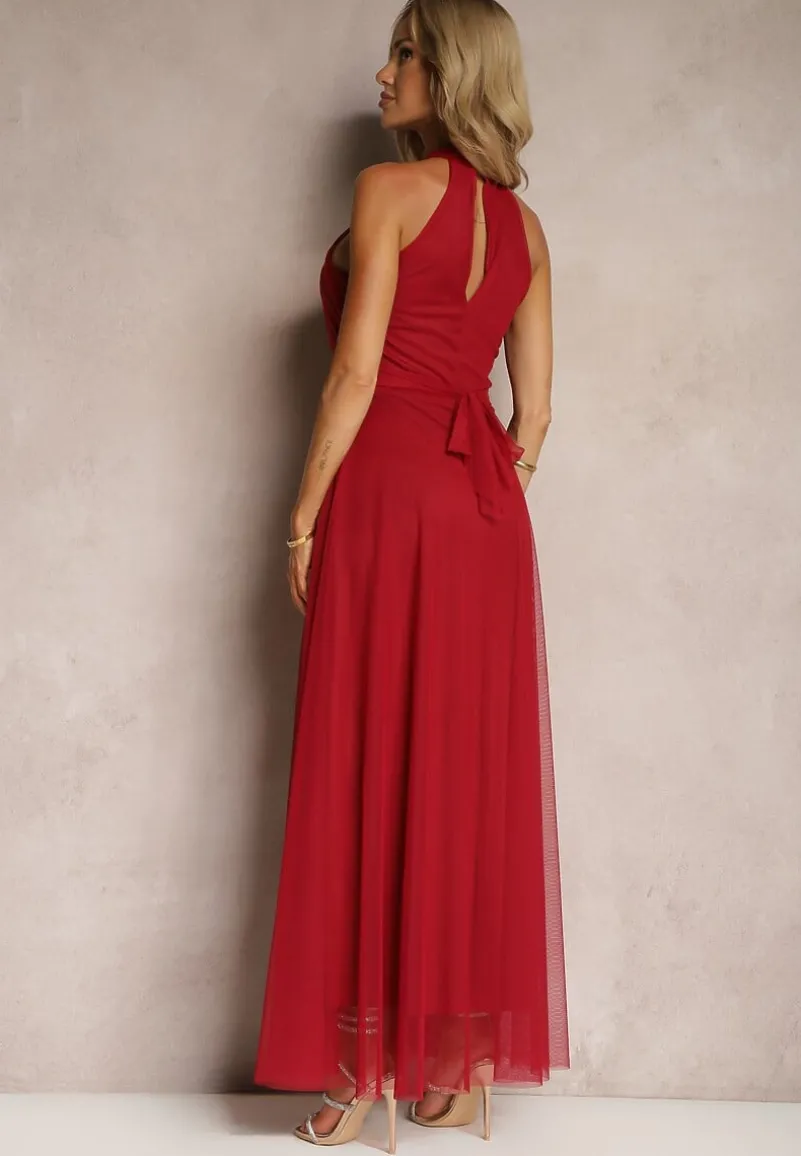 Czerwona Sukienka Koktajlowa z Siateczką Wiązana Materiałowym Paskiem ze Stójką Nestassi