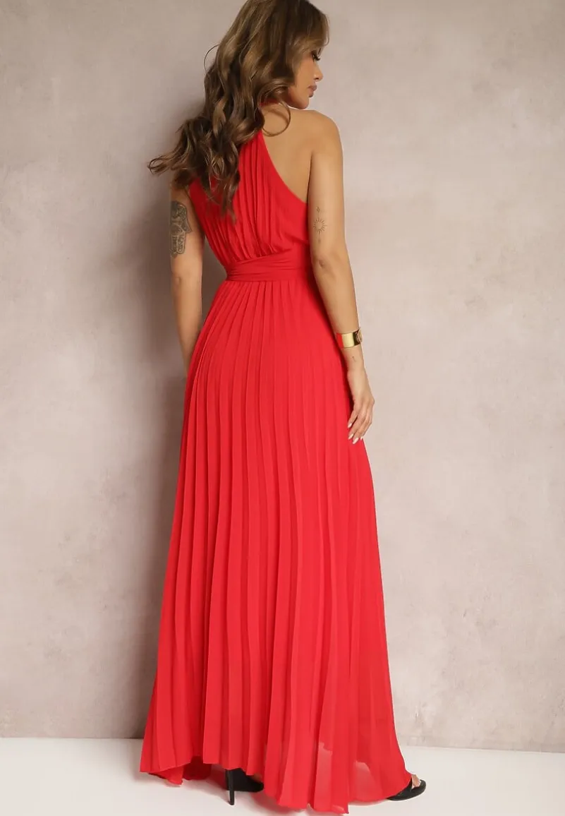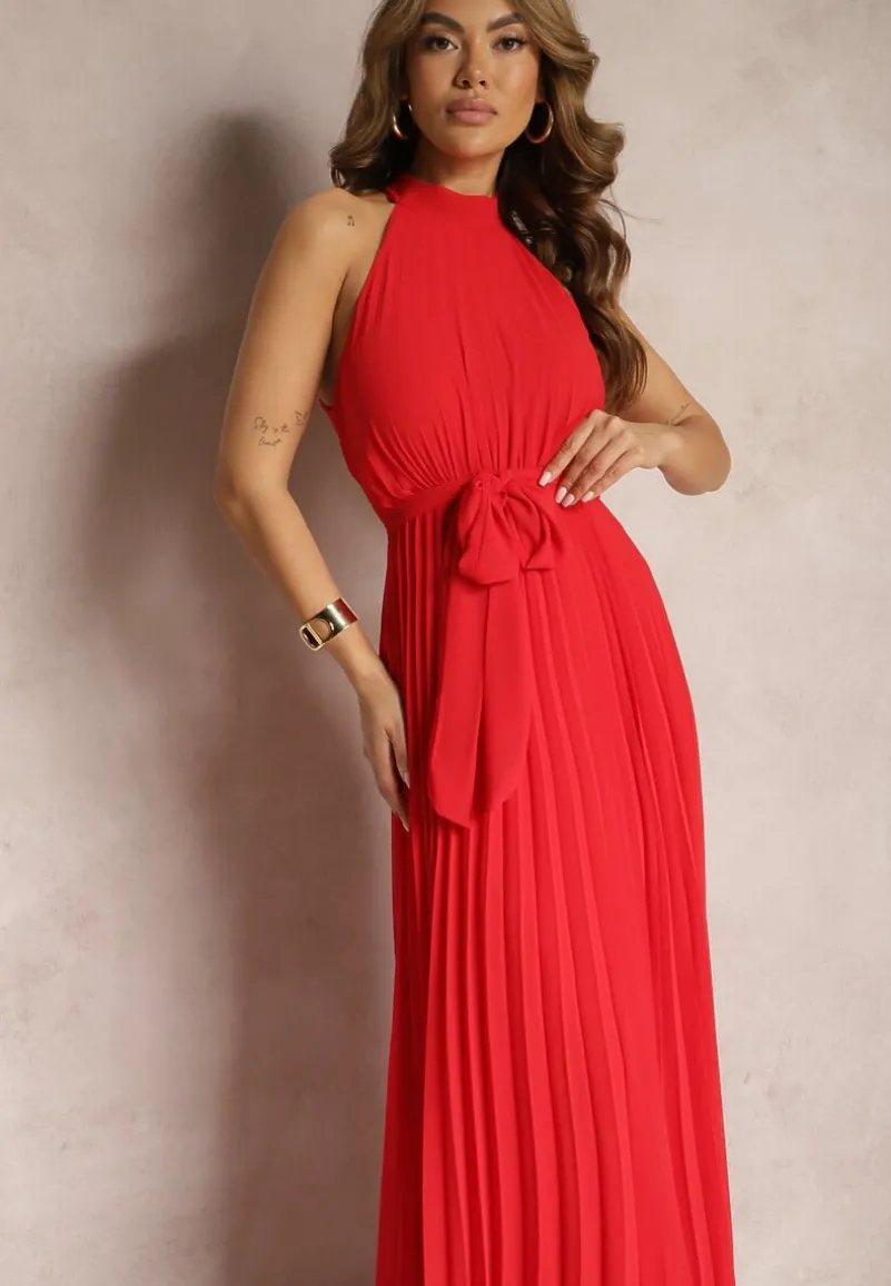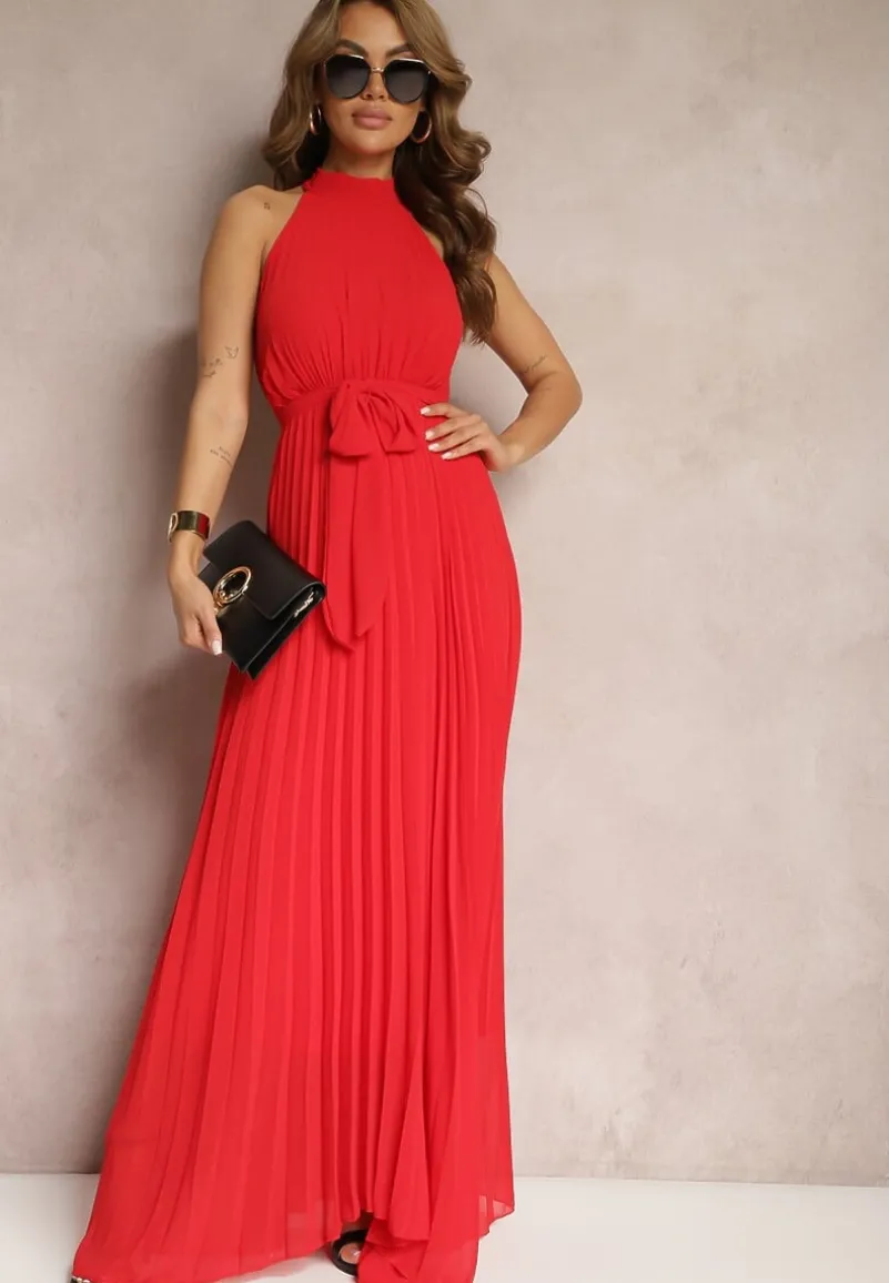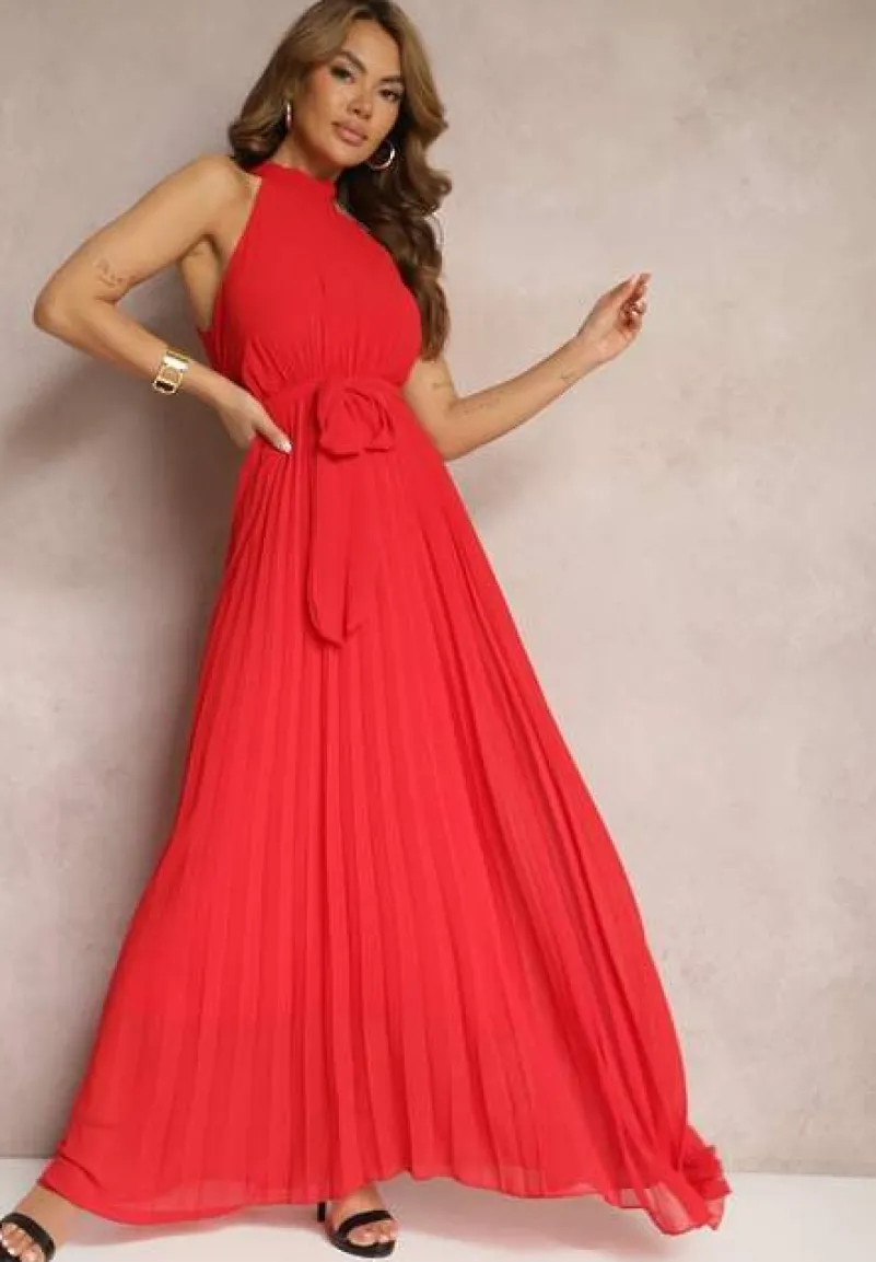 Czerwona Sukienka Maxi bez Rękawów z Gumką w Talii z Plisowanej Tkaniny Pesstia